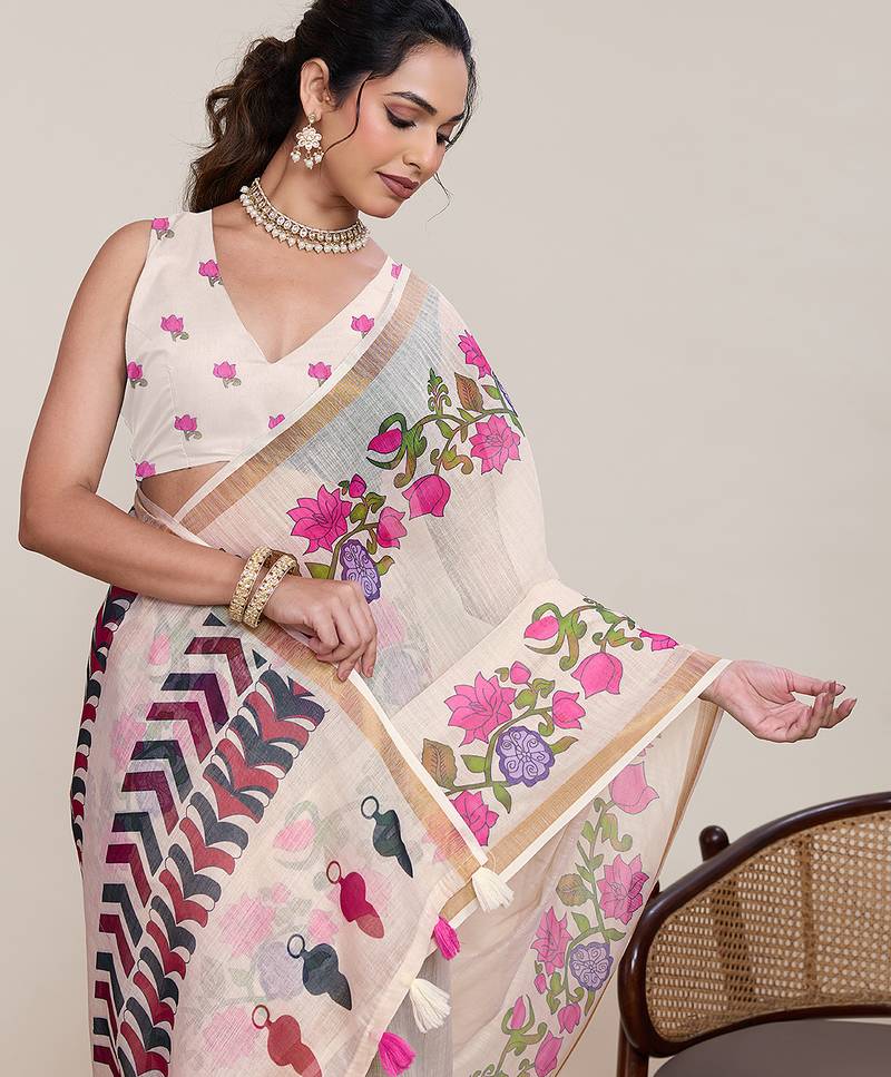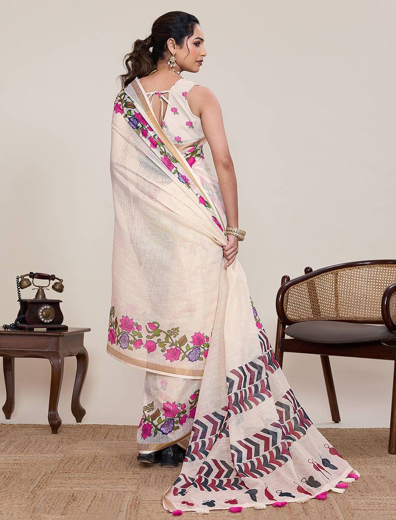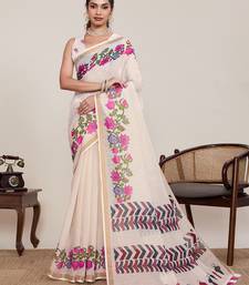 Off white color linen silk fabric beautiful partywear saree