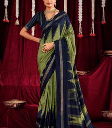 Olive green & navy blue color ikkat art silk fabric designer zig zag printed traditional party looks saree