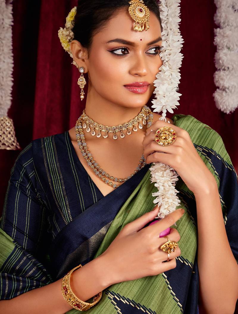 | Product Name | Olive Green & Navy Blue Color Ikkat Art Silk Fabric Designer Zig Zag Printed Traditional Party Looks Saree | |