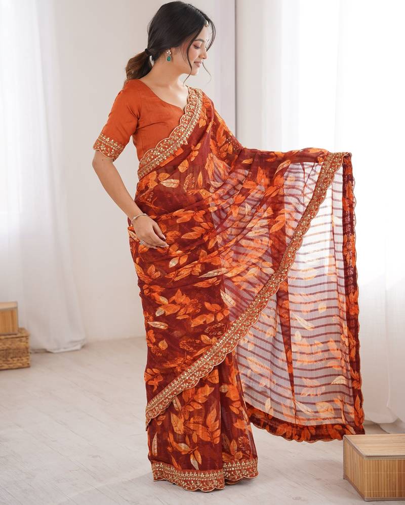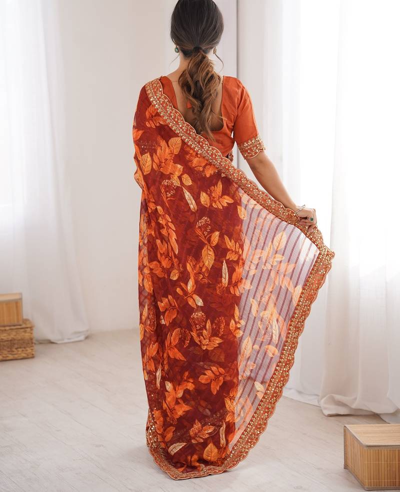 Orange color marble patta fabric stylish festive special saree