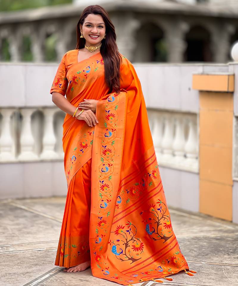 Orange color paithani silk blend fabric woven meenakari jacquard designer graceful wedding saree