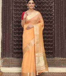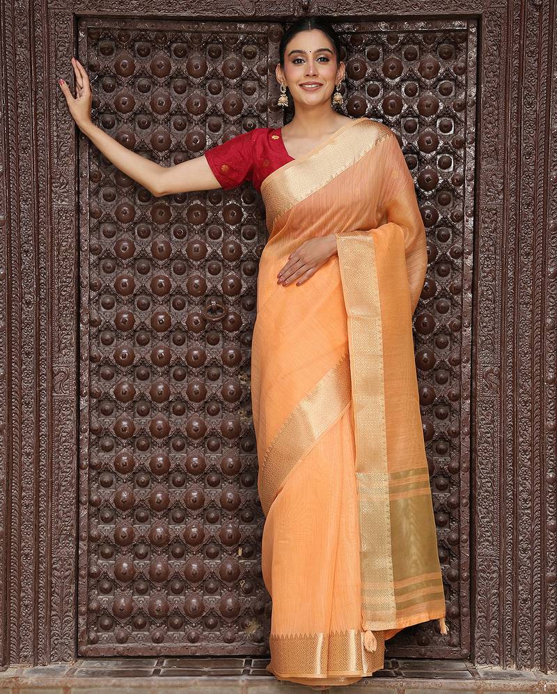 Orange color rich ethnic cotton based saree with rich woven designer looks