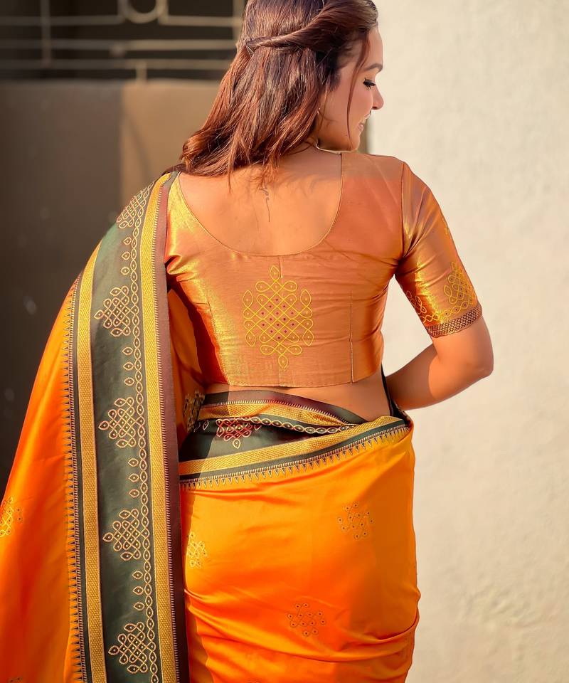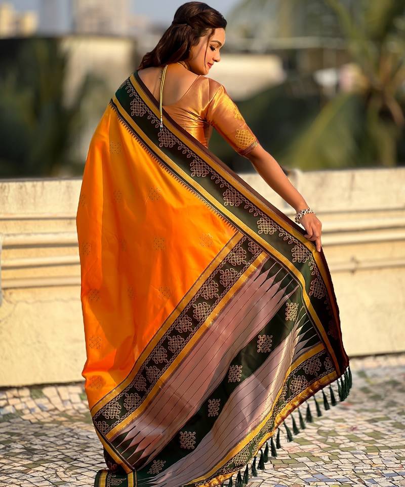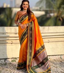 Orange color soft silk blend woven designer saree for ceremonial looks
