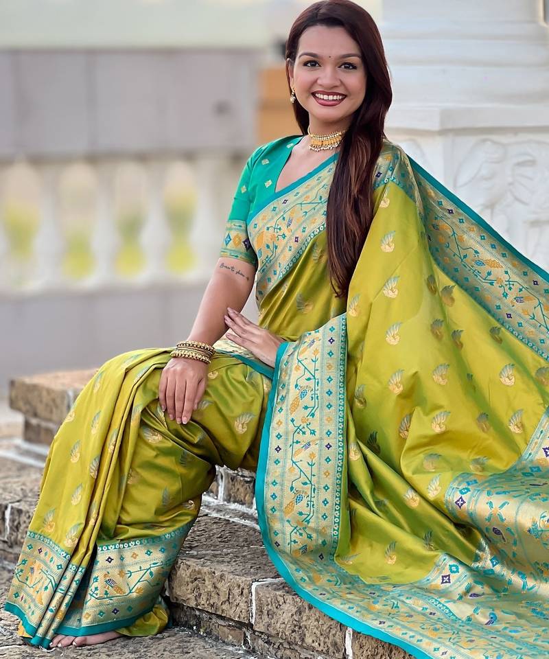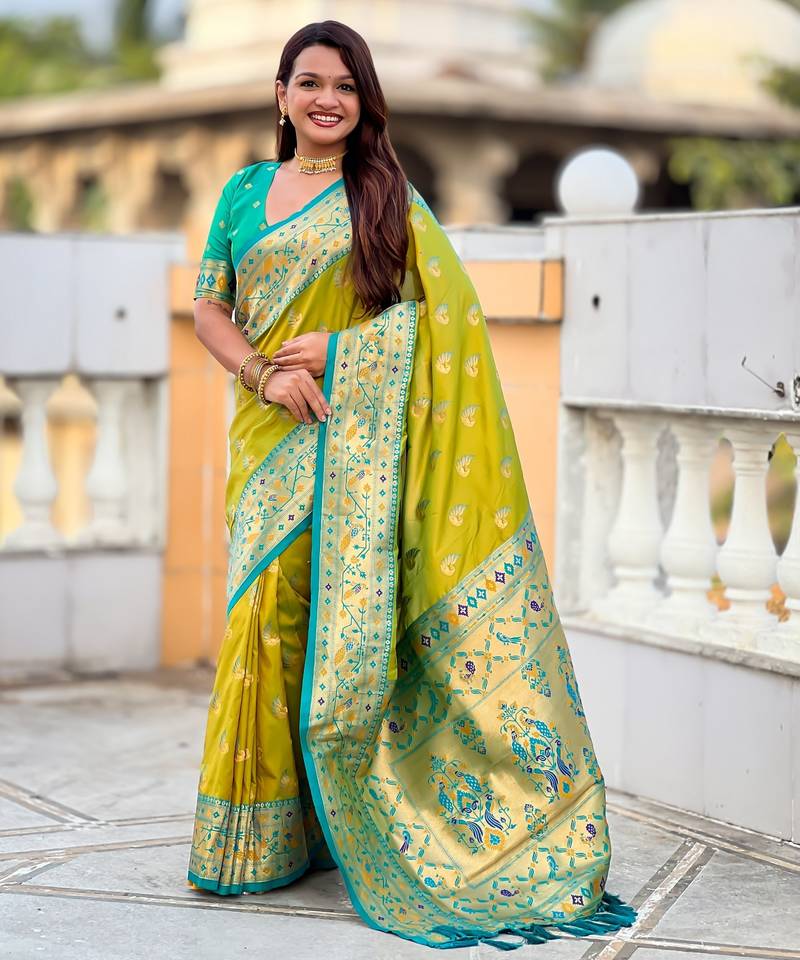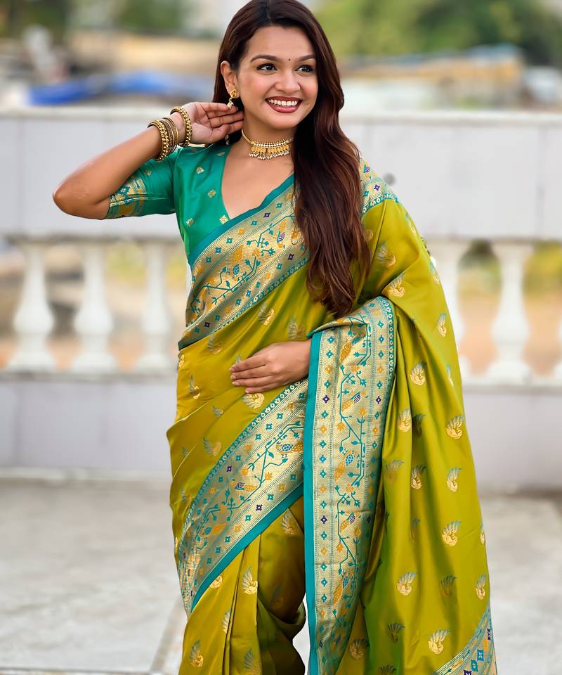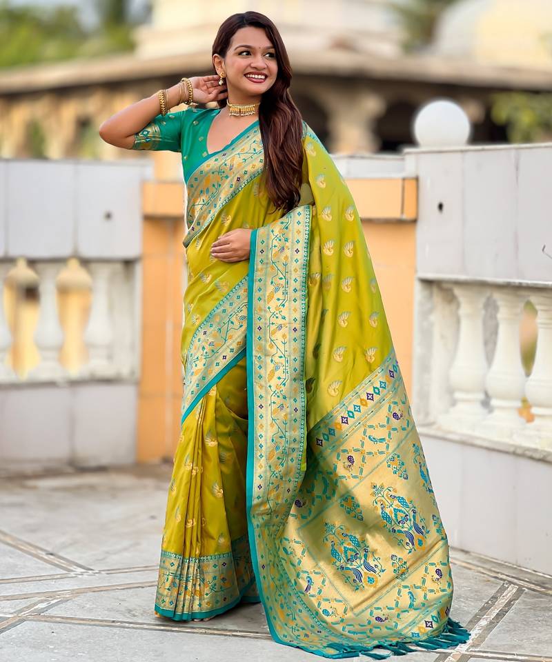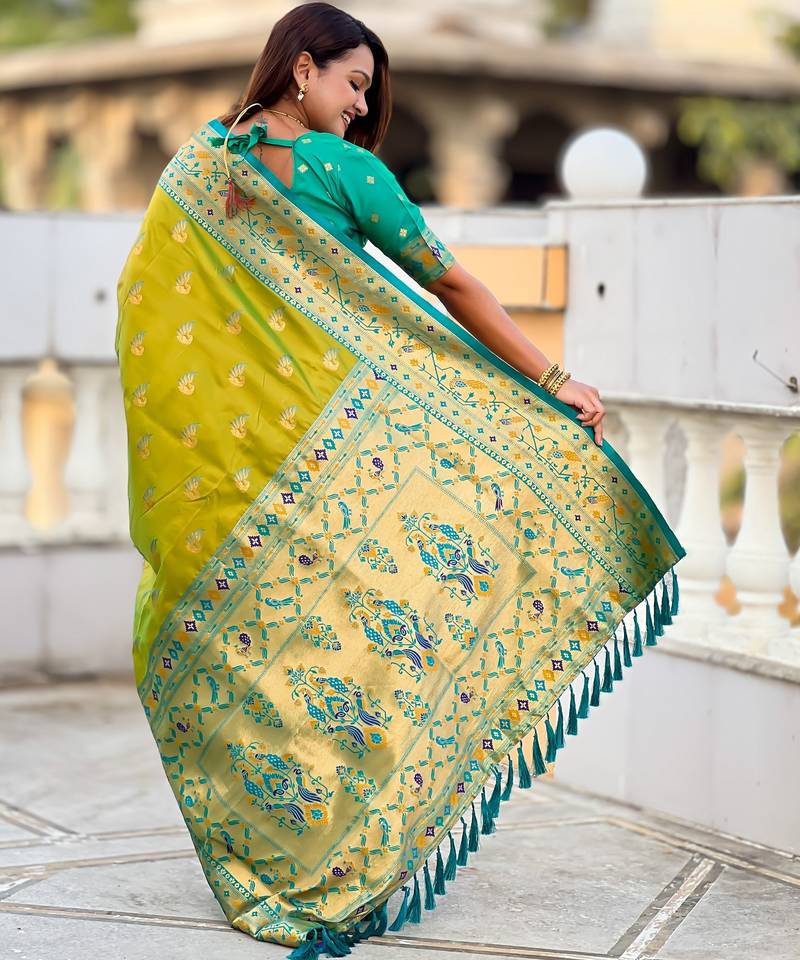 Parrot green color paithani silk blend woven meenakari jacquard designer saree