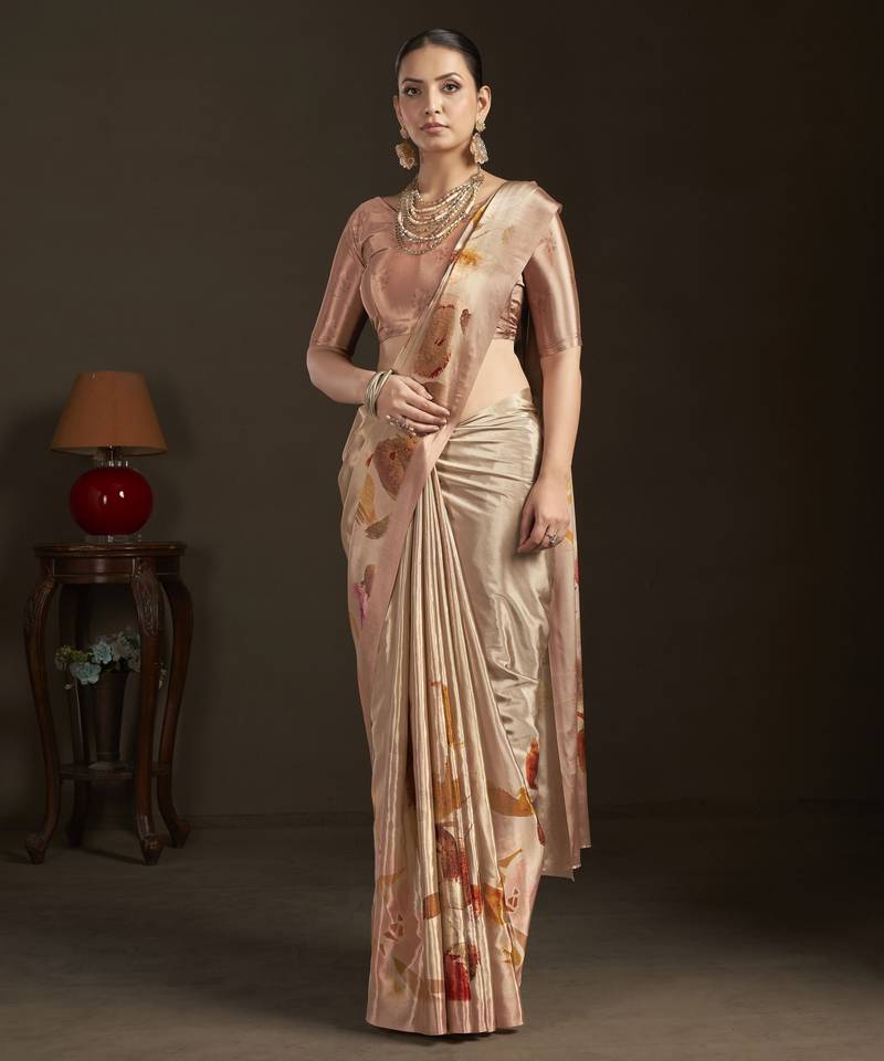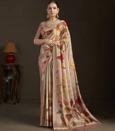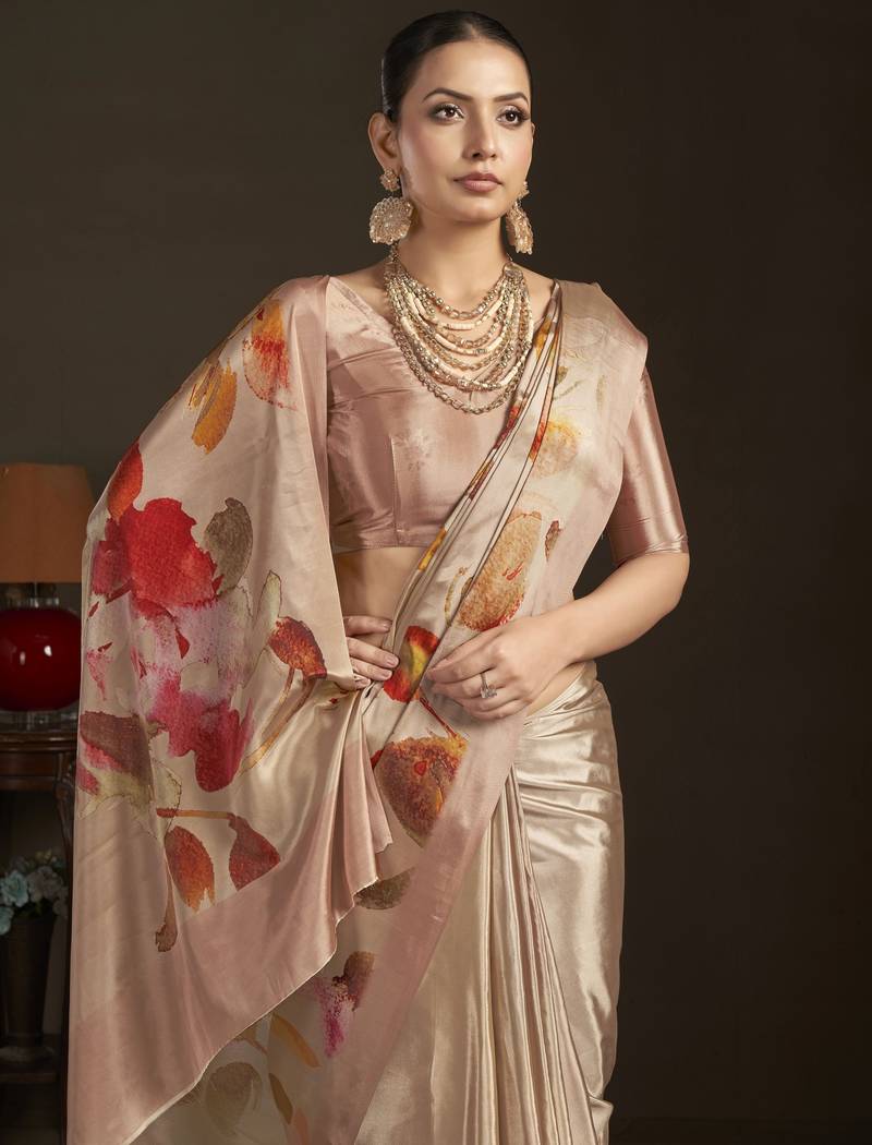 Peach color stylish digital printed silk blend crepe fabric saree for trendy looks