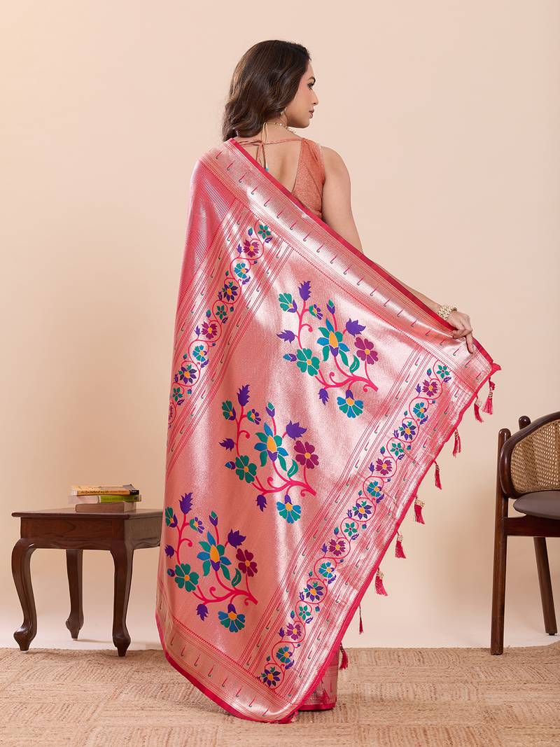 | Product Description | Garb This Party Wear Saree Paired With Blouse.This Saree And Blouse Are Soft Silk Fabric With Woven Paithani Meenakari Designer. Buy This Pretty Saree Now. |