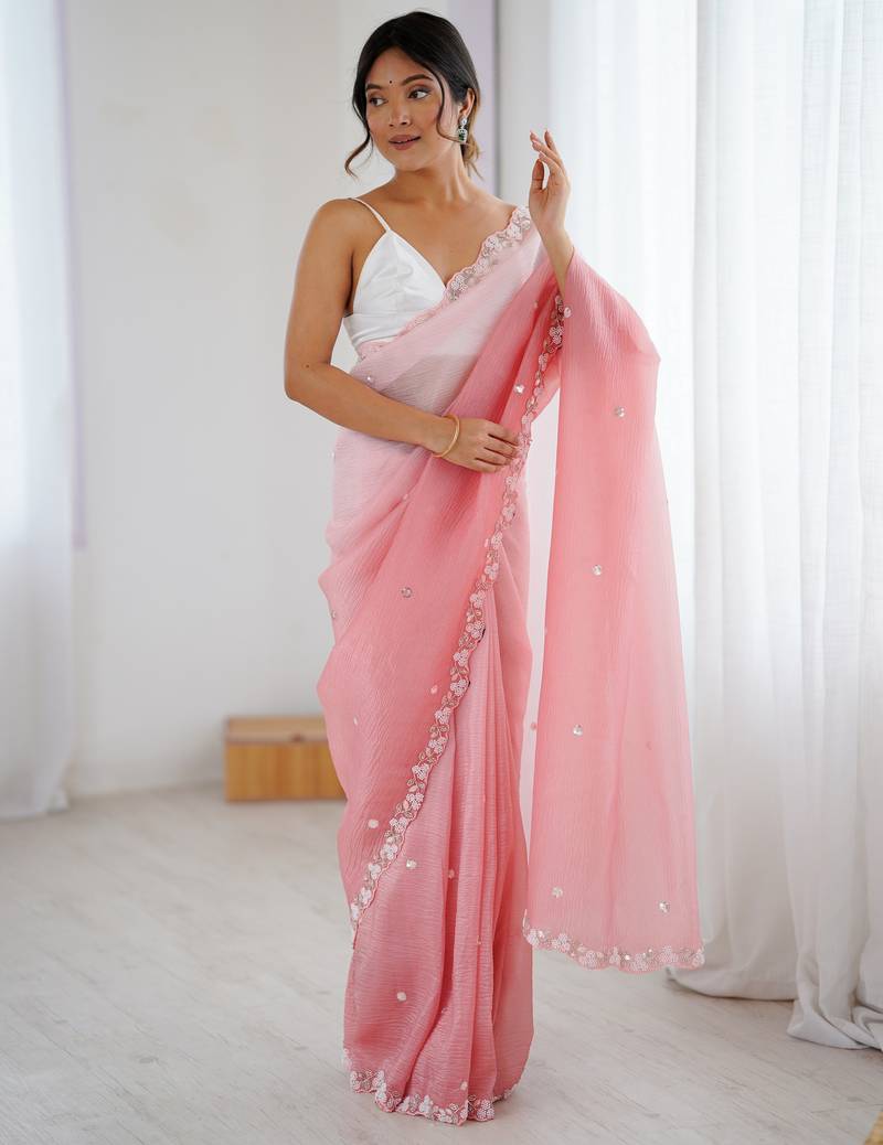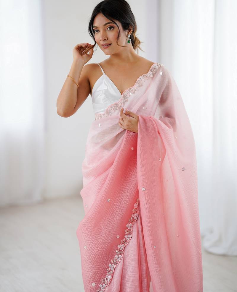 Pink color chiffon crush fabric beautiful sophisticated work ceremonial saree