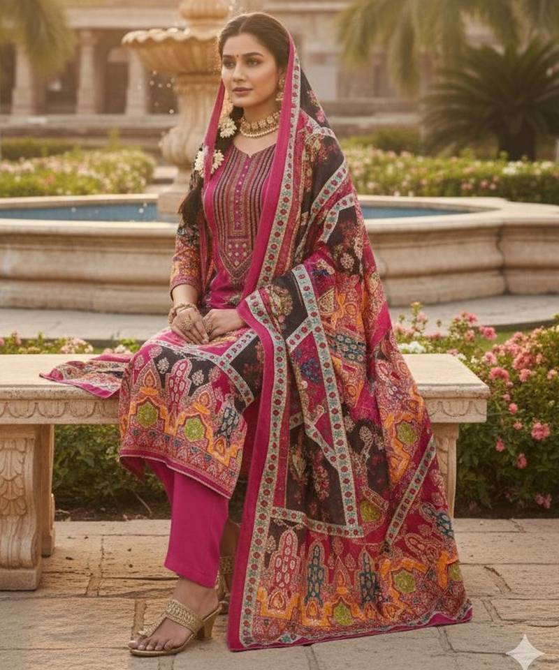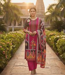 Pink chinon printed ethnic ceremonial suit unstitched