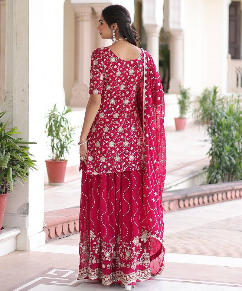| Product Description | Attactive These Beautiful Looking Readymade Sharara Suit With Dupatta.These Top Bottom And Dupatta Is Fabricated On Faux Georgette.Its Beautified With Designer Sequance Embroidery Work. |