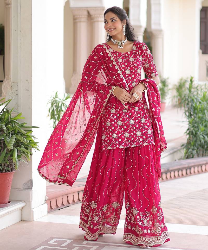 | Product Name | Pink Color Faux Georgette Fabric Glamorous Sequins Designer Partywear Sharara Dress | |