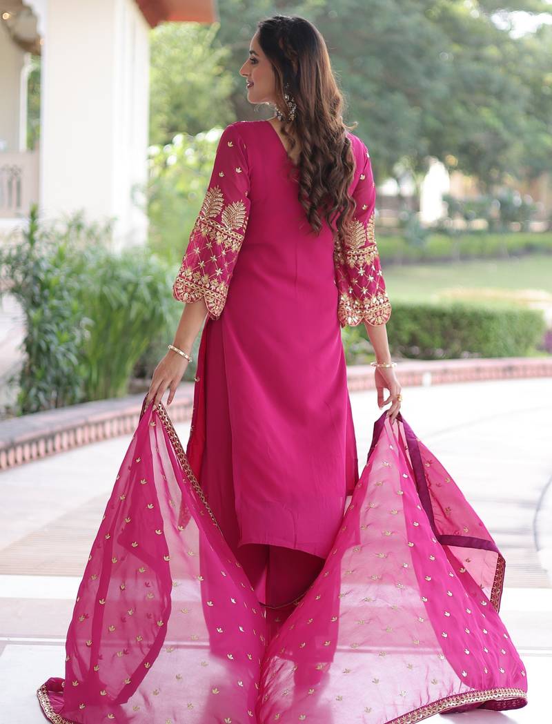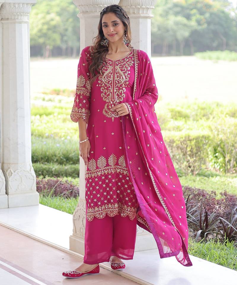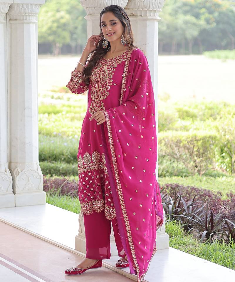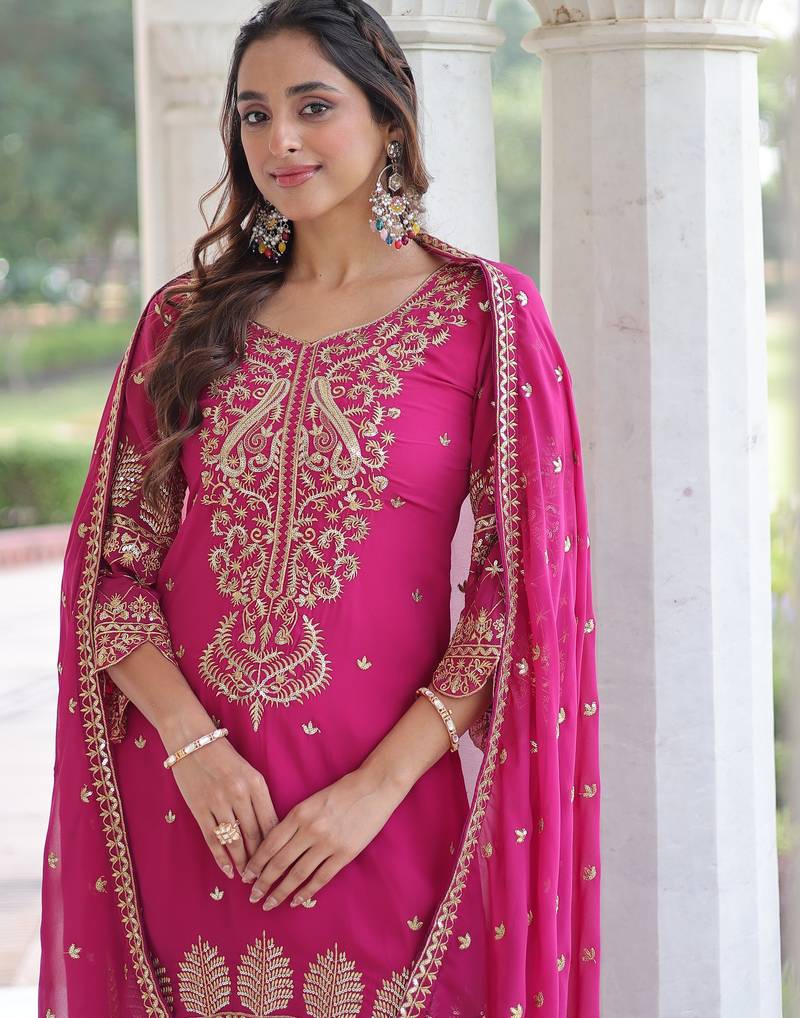 | Product Name | Pink Faux Georgette Embroidered Sequins Embroidered Wedding Ceremonial Sharara Suit | |