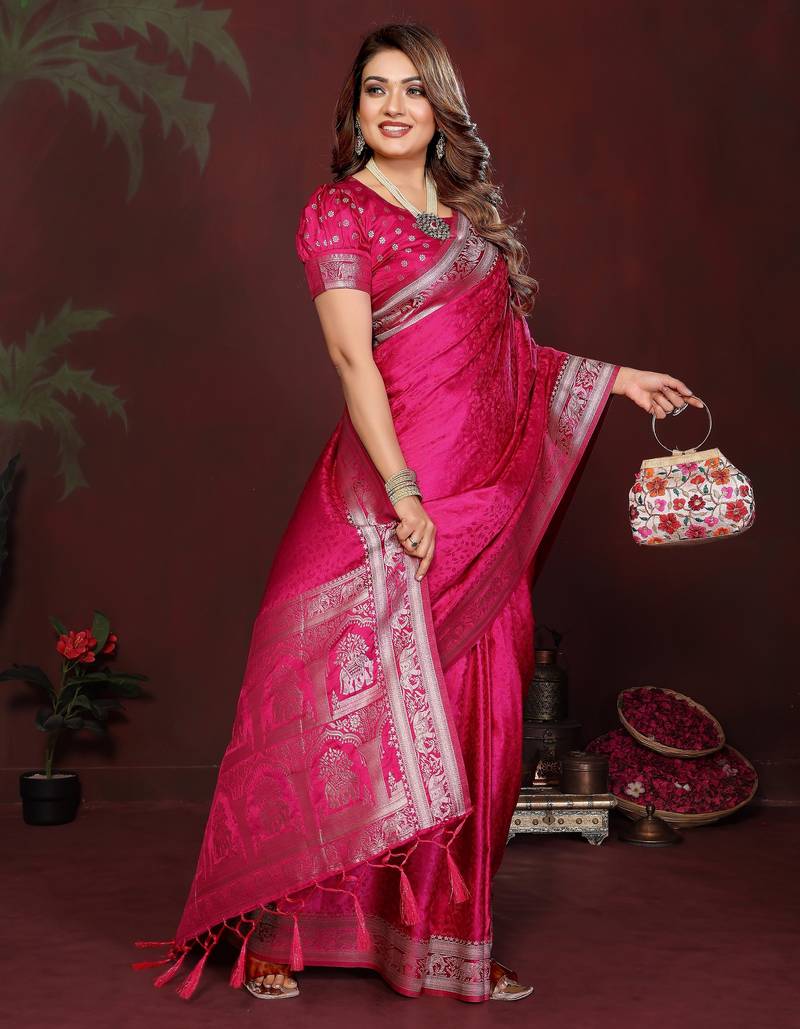 | Product Name | Pink Color Satin Silk Fabric Woven Jari Designer Sophisticated Saree | |