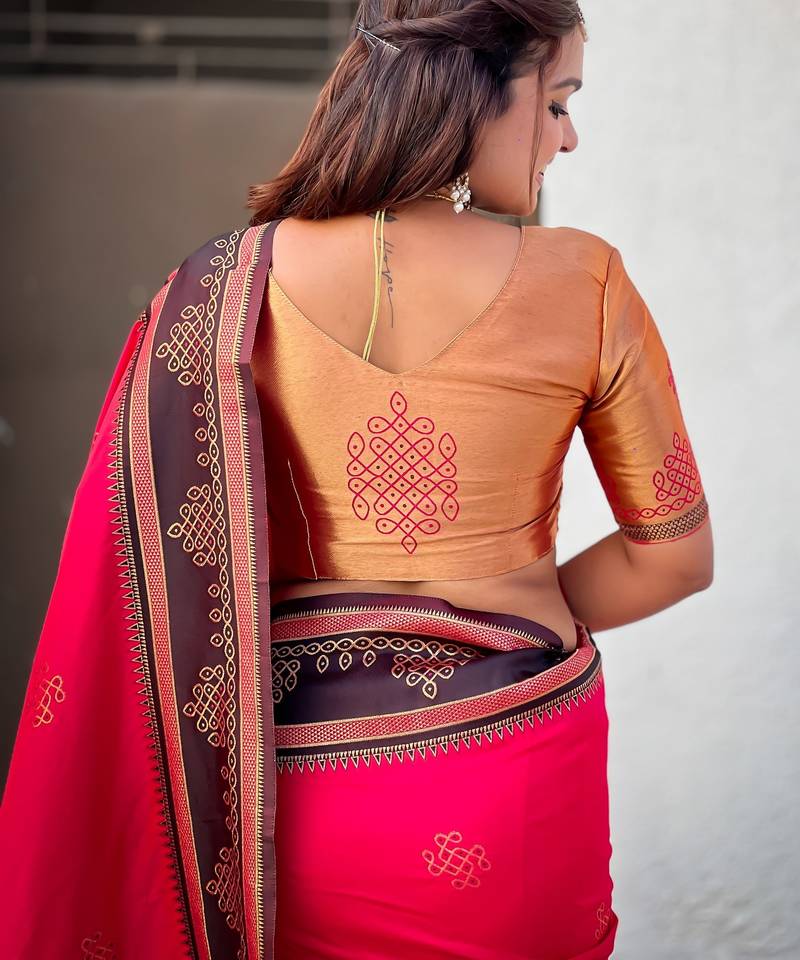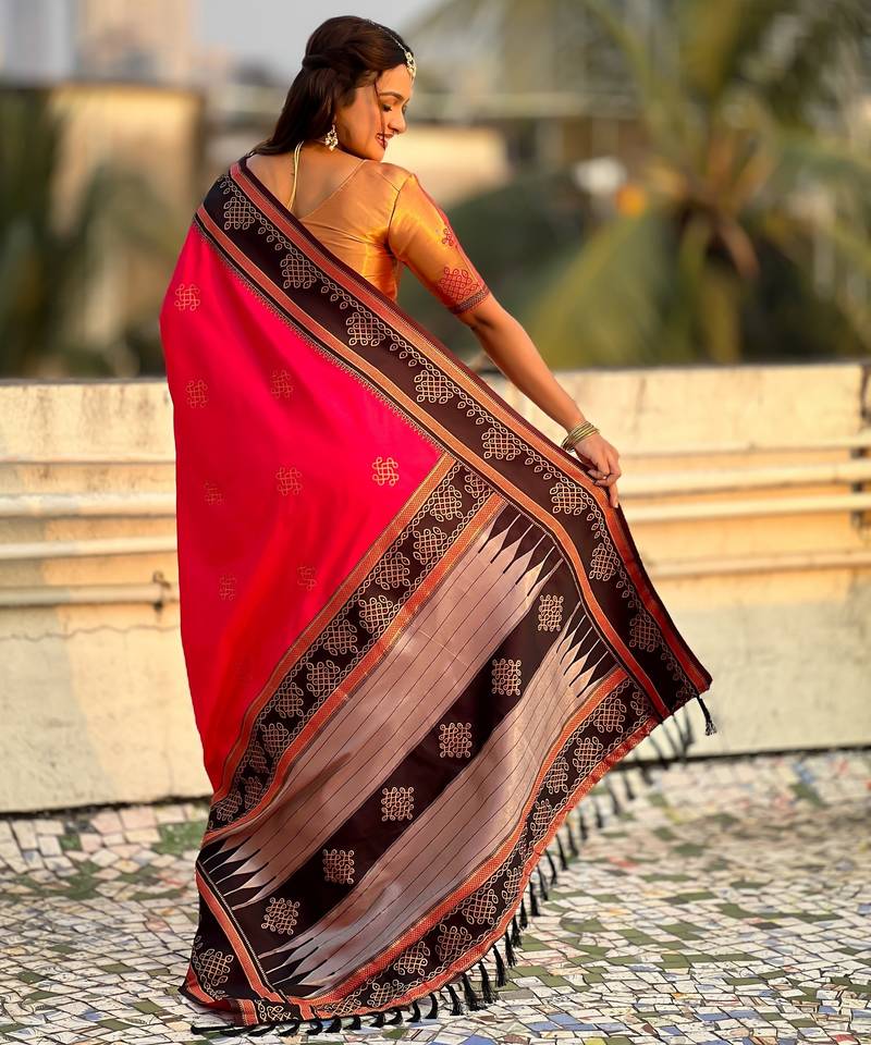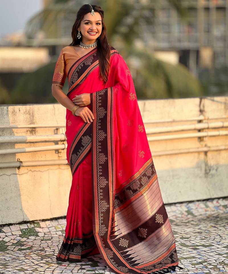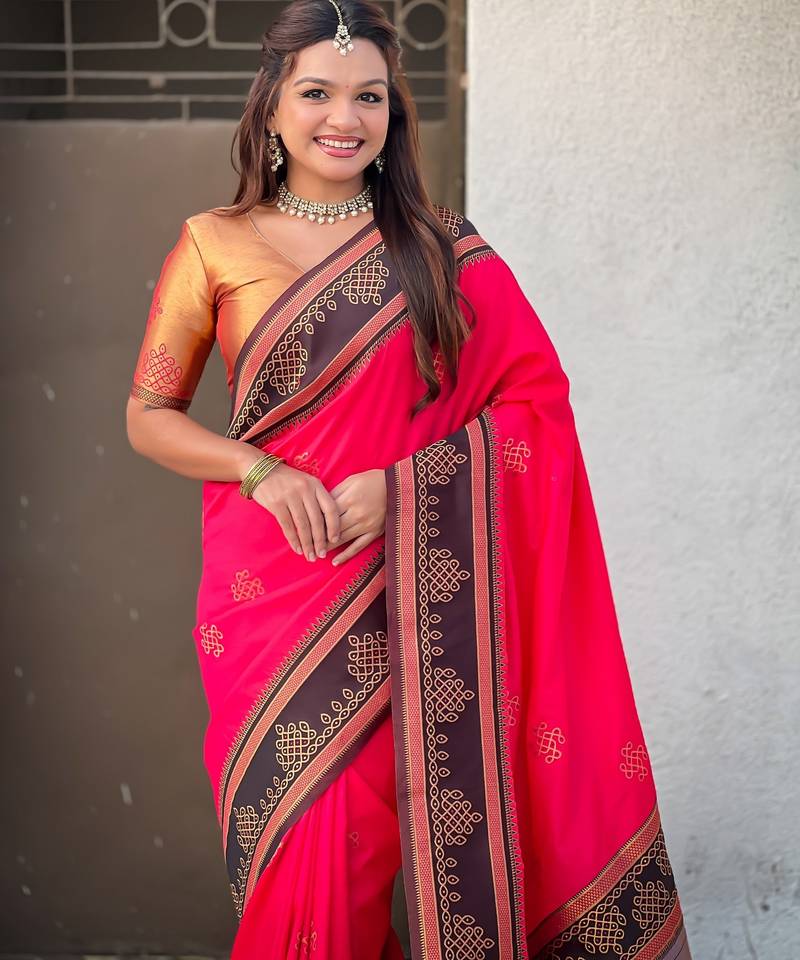 Pink color soft silk blend woven designer saree for ceremonial looks
