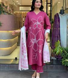 Pink color viscose chanderi fabric embroidery work with printed girlie kurta set with dupatta