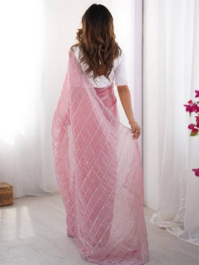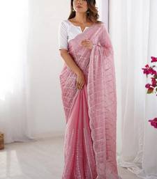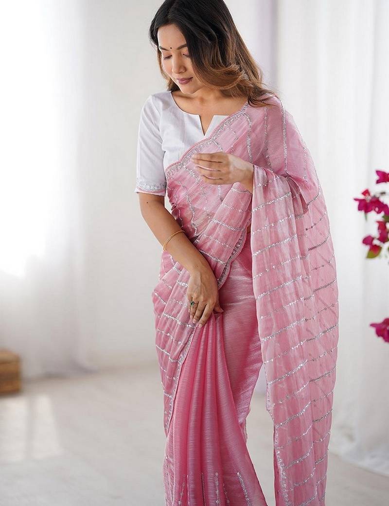 Product Name Pink Color Zimmy Choo Fabric Designer Embroidered Saree For Ceremonial Looks