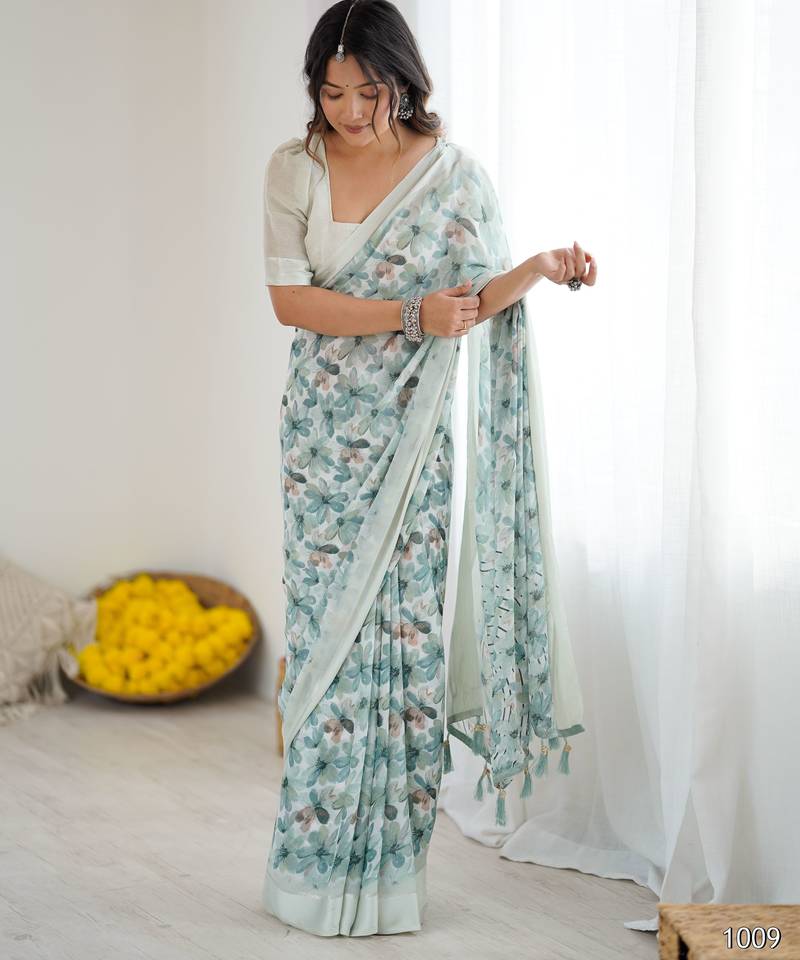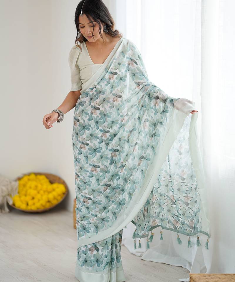 Pista color ethnic printed georgette fabric girlie partywear saree
