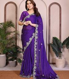 Purple color satin chiffon fabric designer embroidered ethnic saree