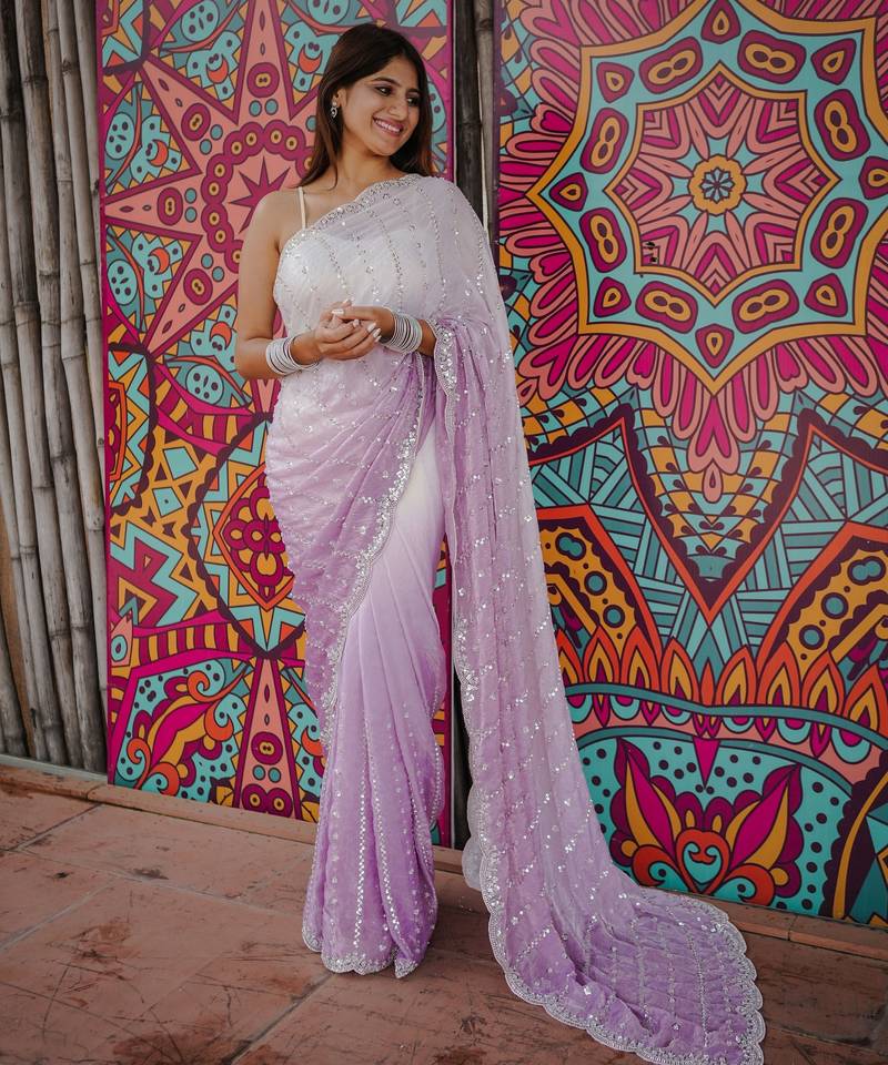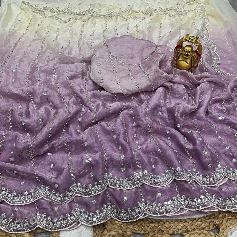 | Product Name | Purple Color Trendy Fendy Satin Fabric Pedding With Beads Hand Work Saree | |