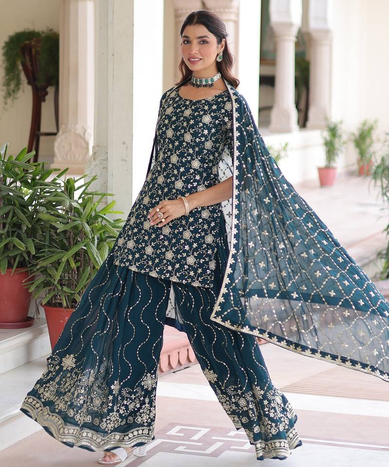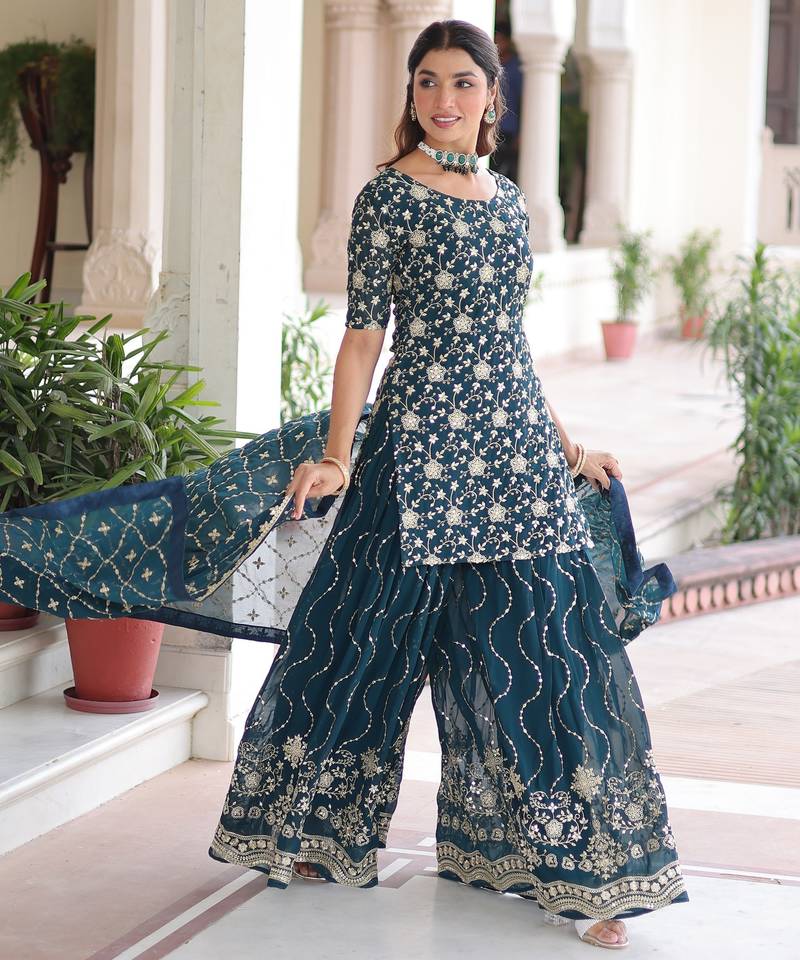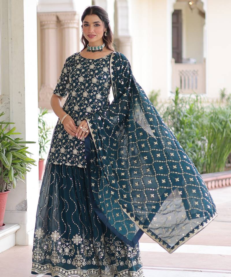 | Product Description | Attactive These Beautiful Looking Readymade Sharara Suit With Dupatta.These Top Bottom And Dupatta Is Fabricated On Faux Georgette.Its Beautified With Designer Sequance Embroidery Work. |