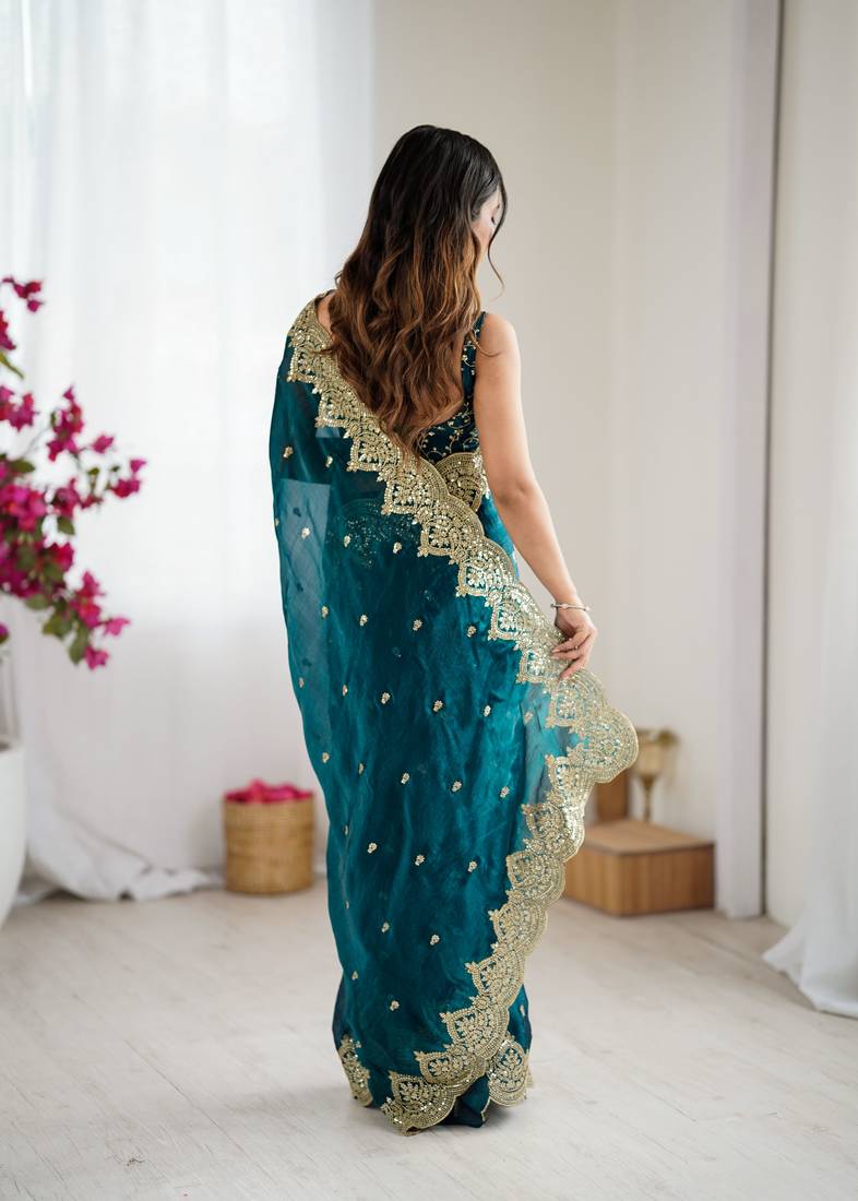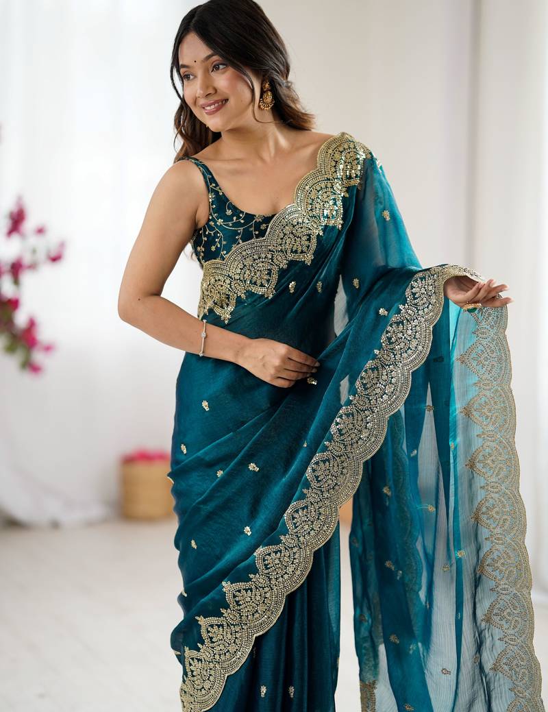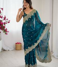 Rama color fendy chiffon fabric beautiful embroidered saree