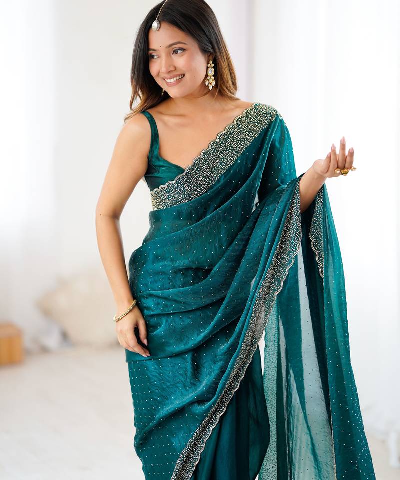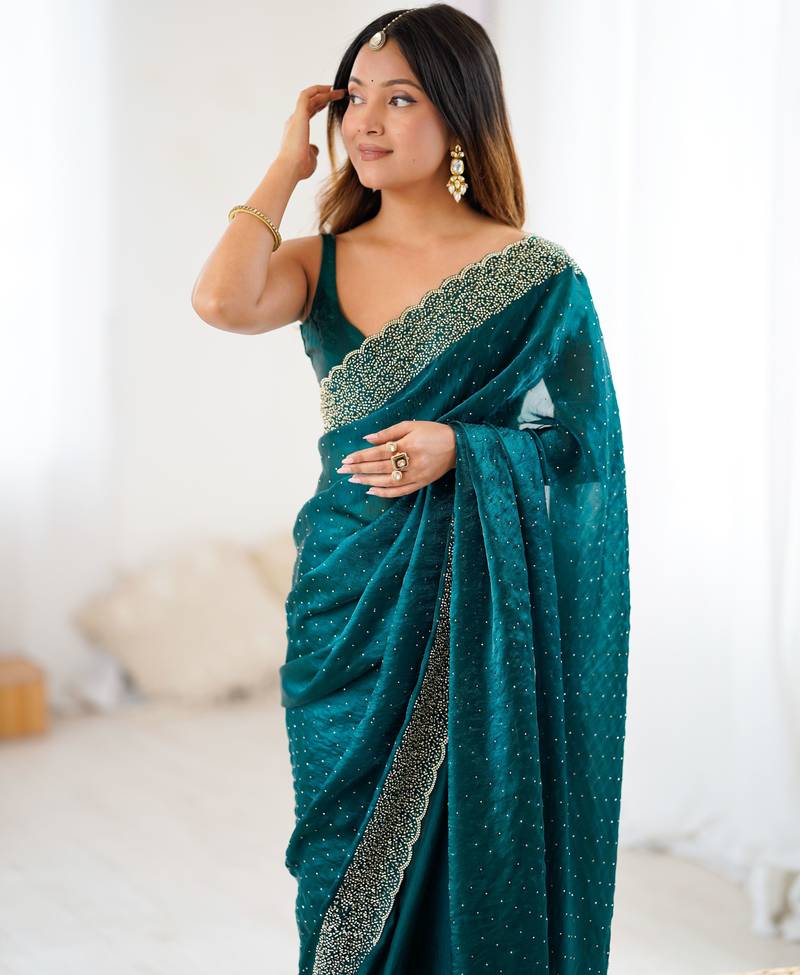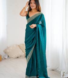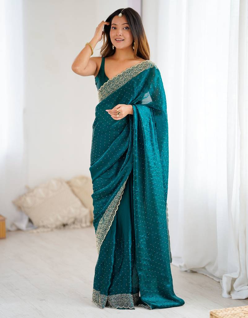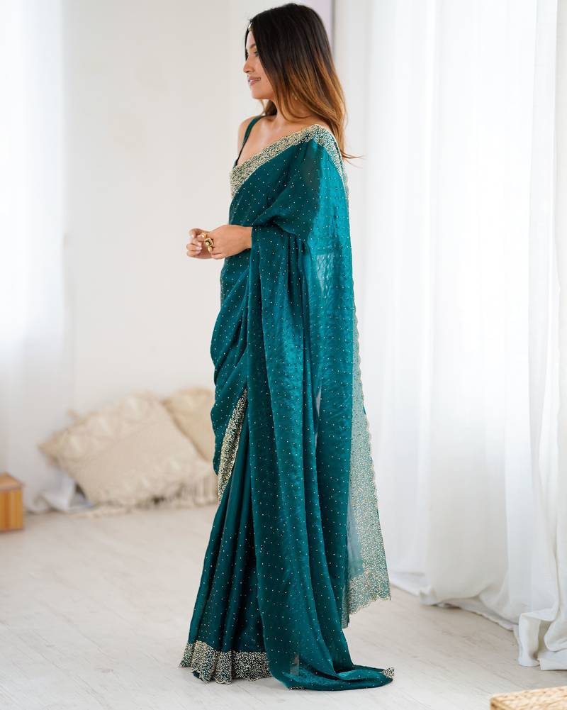 Rama color chiffon fabric zarkan hand work designer bollywood style saree