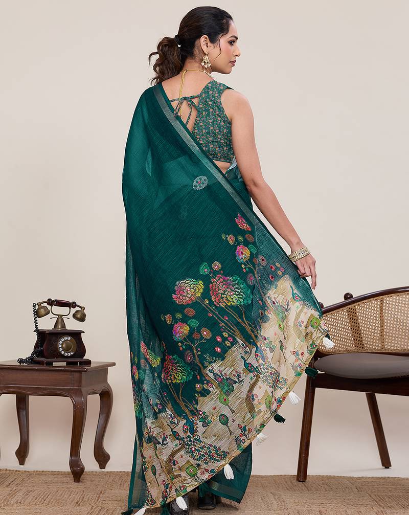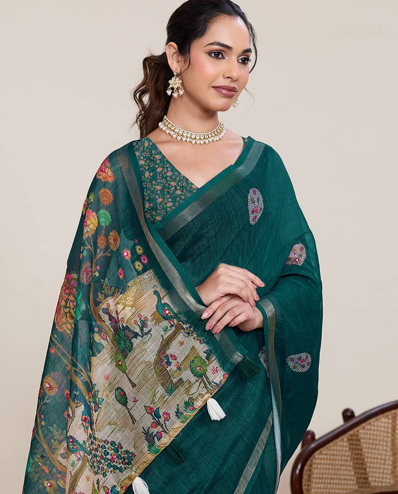 Rama color linen silk fabric ethnic partywear saree