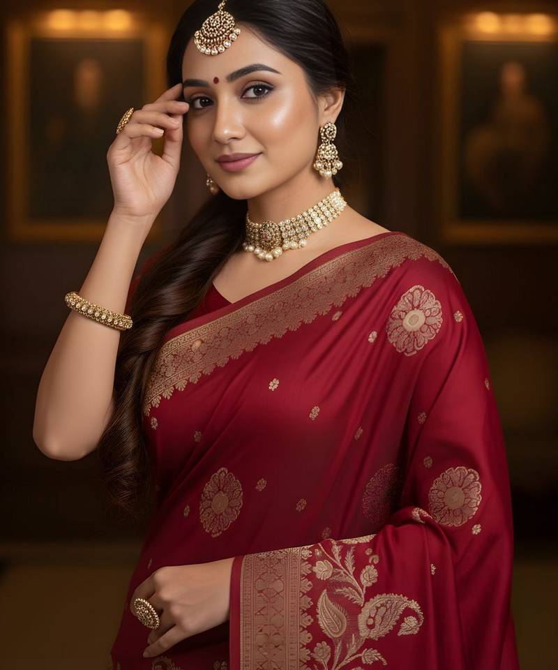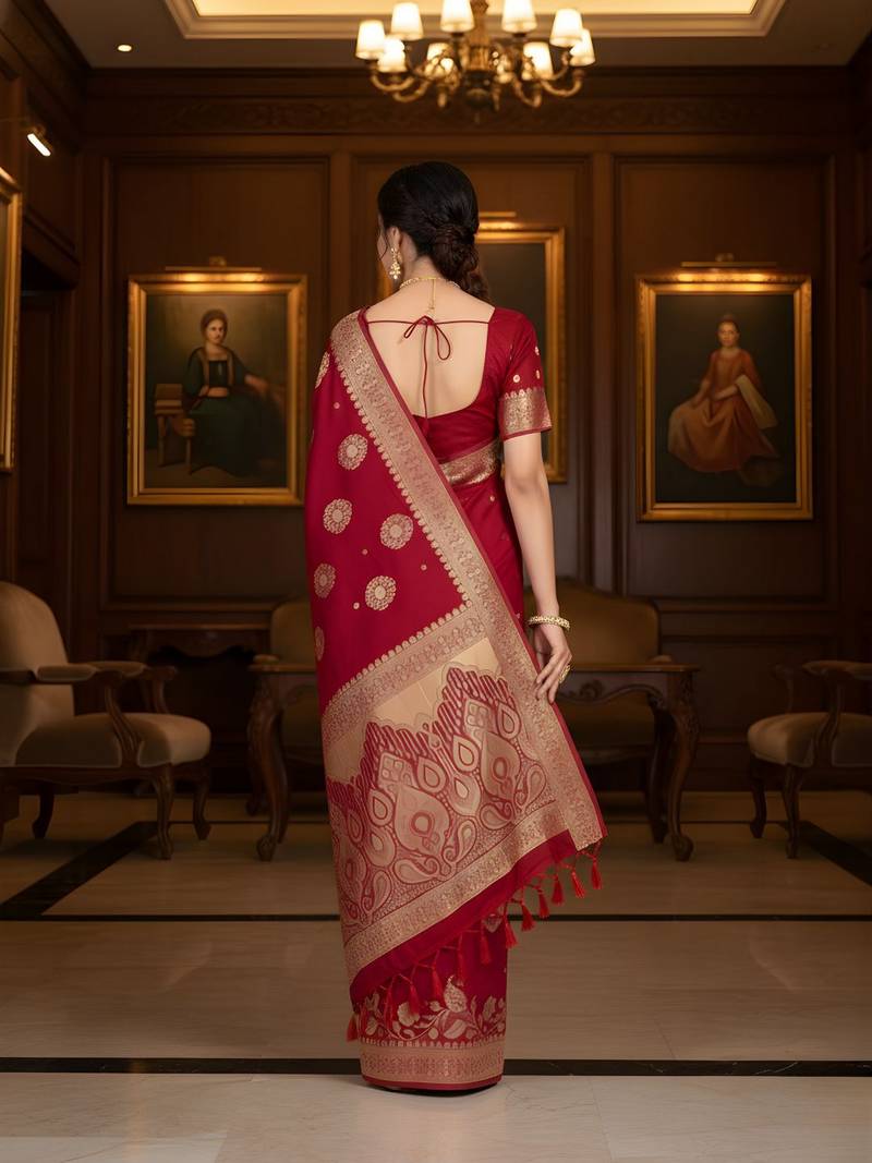 Red color ethnic crepe silk blend fabric woven jacquard designer ceremonial saree