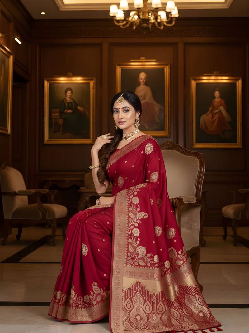 | Product Name | Red Color Ethnic Crepe Silk Blend Fabric Woven Jacquard Designer Ceremonial Saree | |