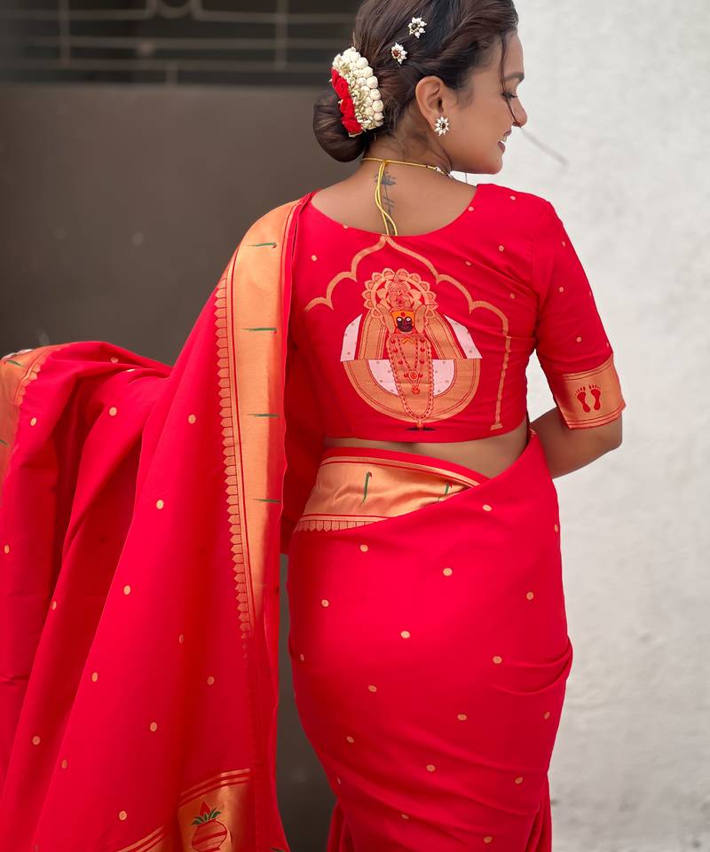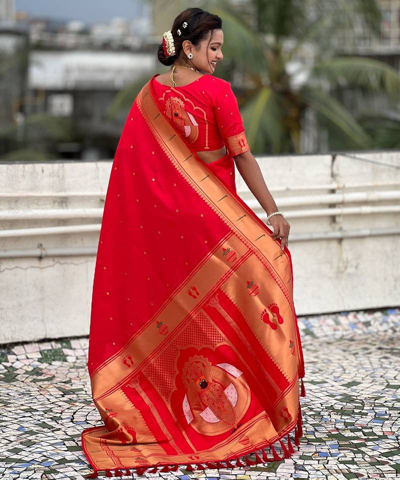 | Product Name | Red Color Soft Silk Blend Fabric Woven Paithani Designer Cultural Rich Saree | |