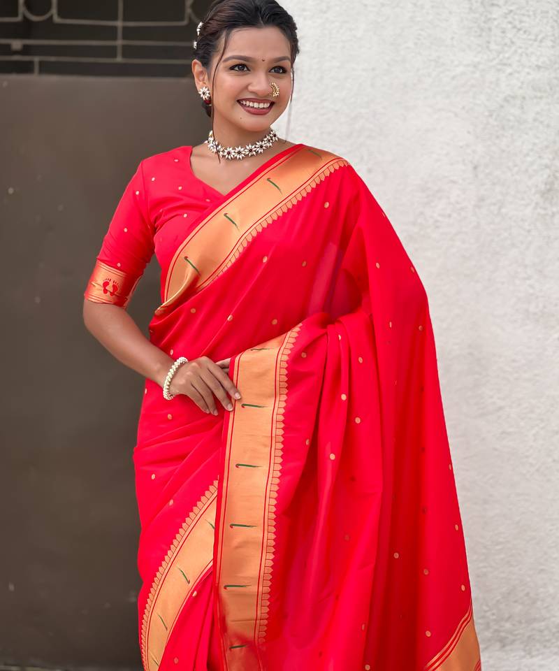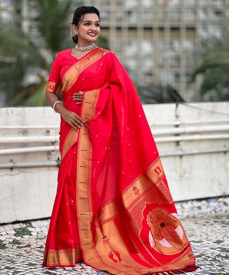 Red color soft silk blend fabric woven paithani designer cultural rich saree