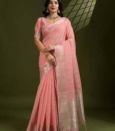 Rust color tissue linen art silk weaving checks designer graceful trendy saree