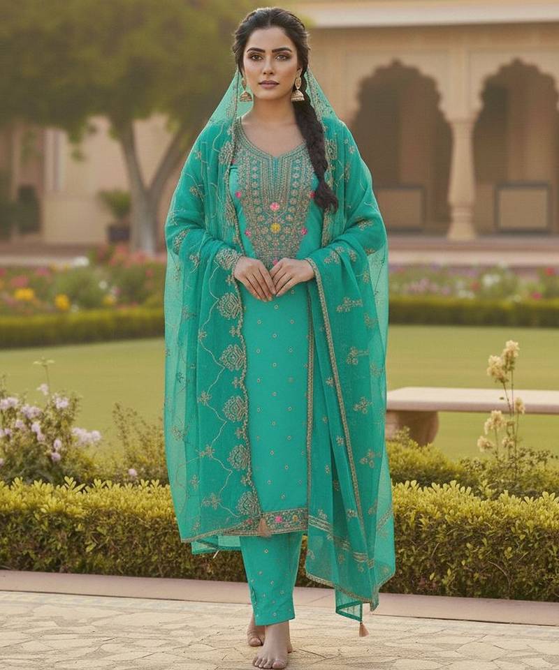 | Product Name | Sea Green Color Chanderi Butti Fabric Beautiful Embroidered Suit | |