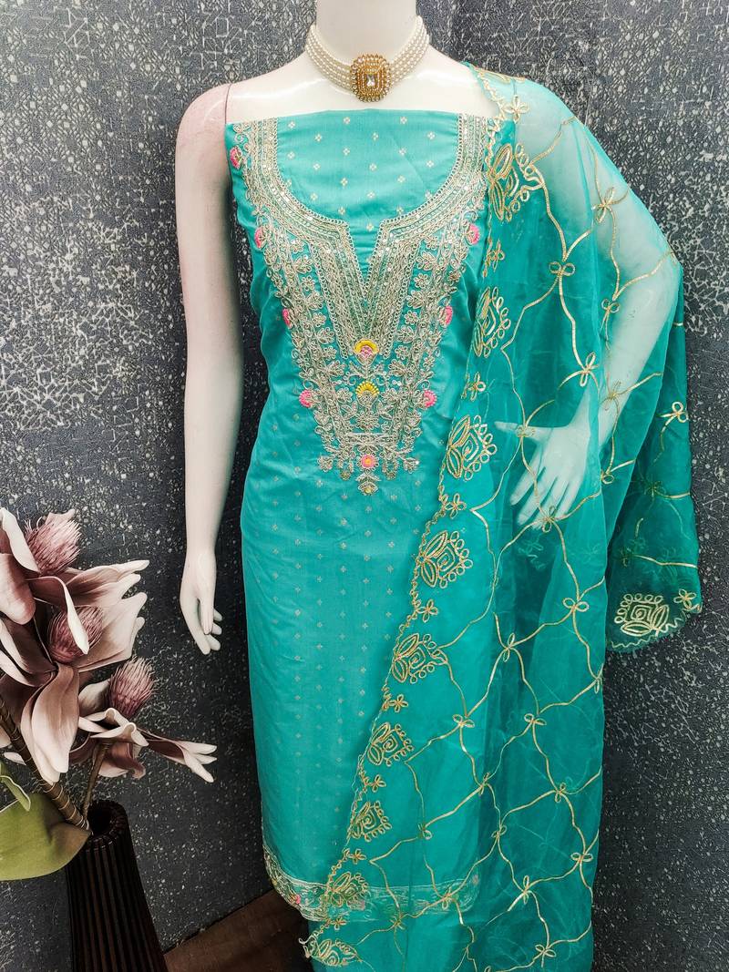 Sea green color chanderi butti fabric beautiful embroidered suit unstitched