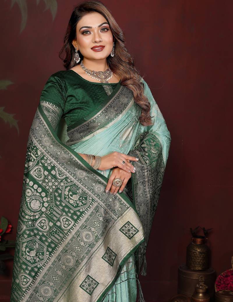Sea green color satin silk fabric woven jari designer graceful partywear saree