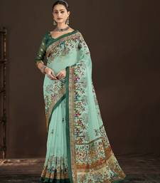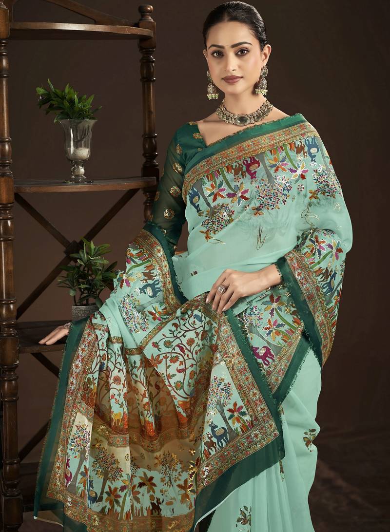 Sky blue color crepe silk blend fabric designer foil printed saree