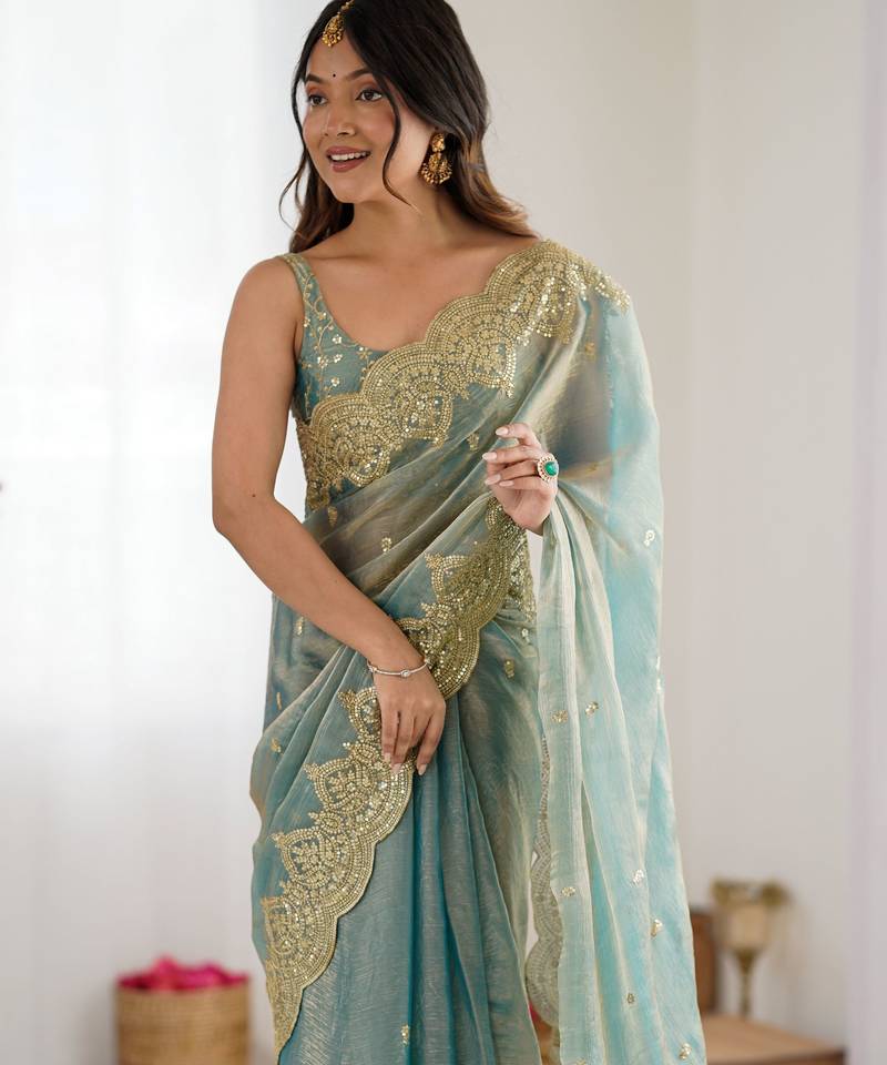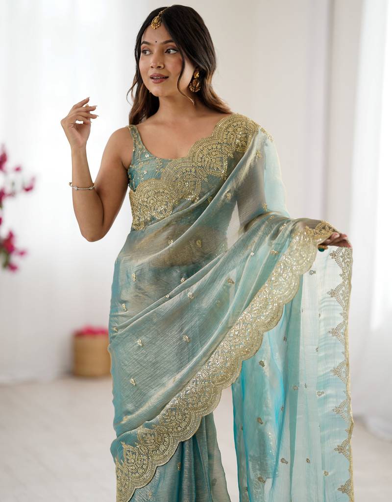 Sky blue color fendy chiffon fabric beautiful embroidered saree
