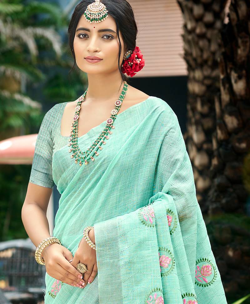 | Product Name | Sky Blue Color Linen Fabric Woven Designer Saree With Floral Embroidered Work | |