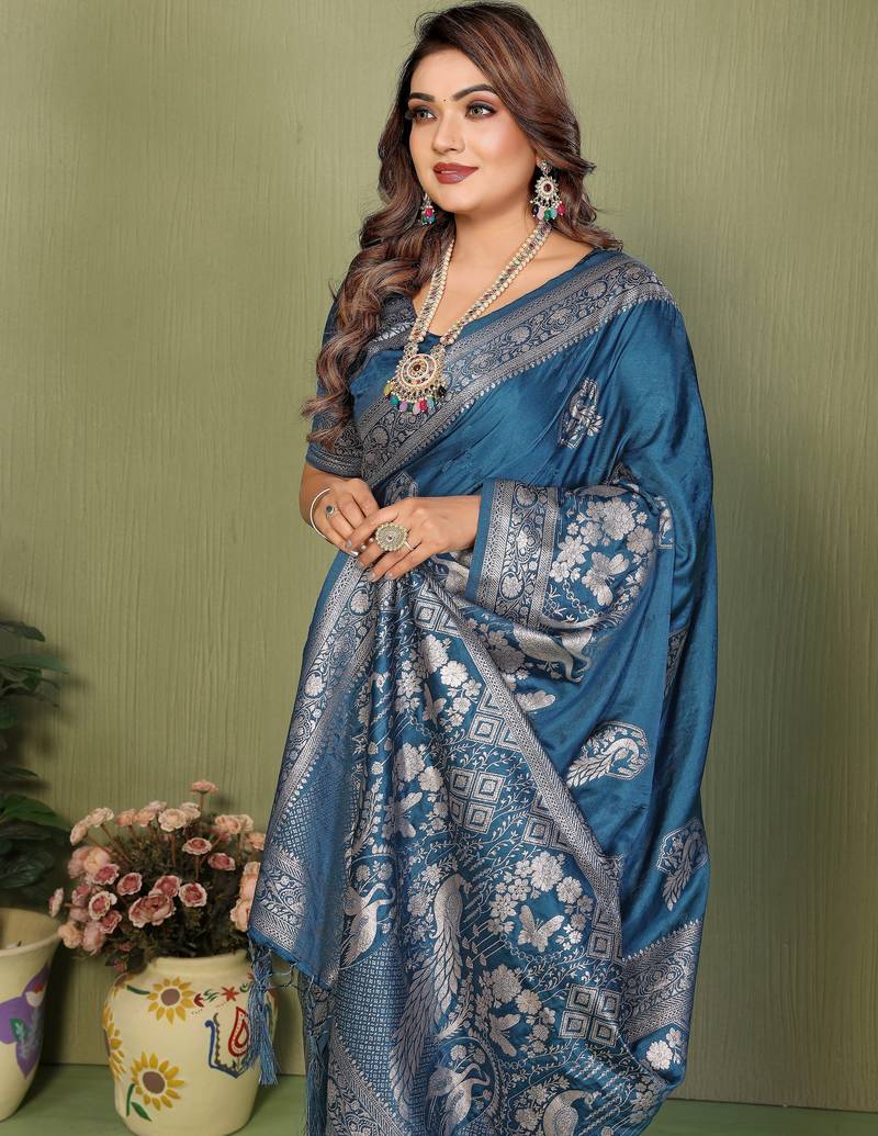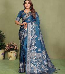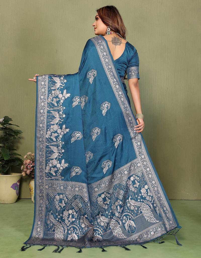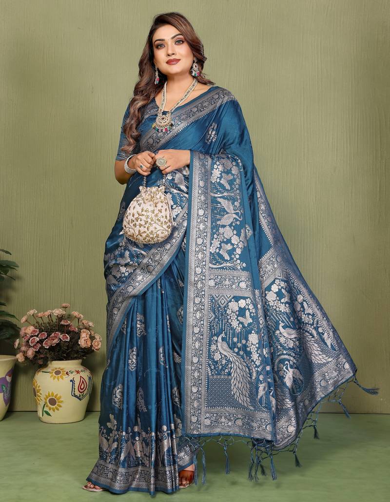 Teal blue color satin silk fabric woven jari designer partywear saree
