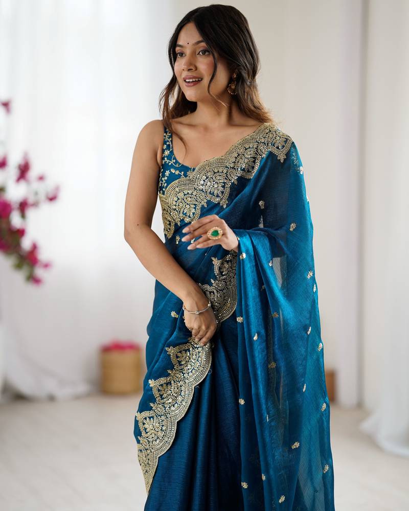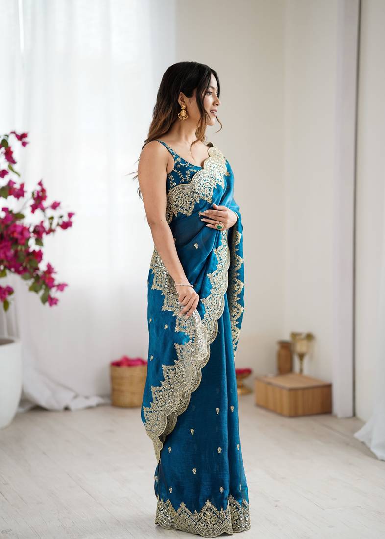 Teal color fendy chiffon fabric beautiful embroidered saree