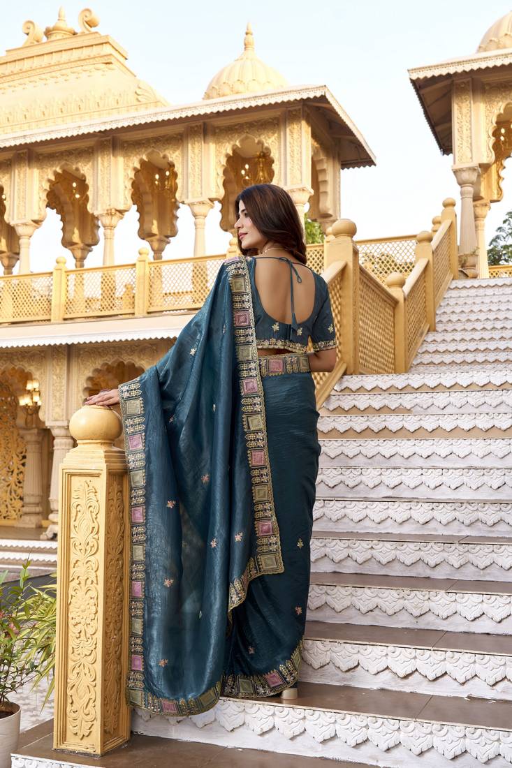 Teal color gold crunchy silk multy thread embroidery work rich fancy saree