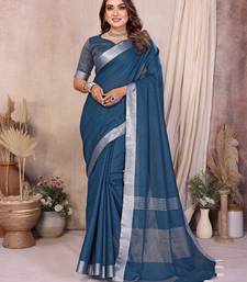 Teal color linen cotton fabric woven silver jari designer ceremonial saree