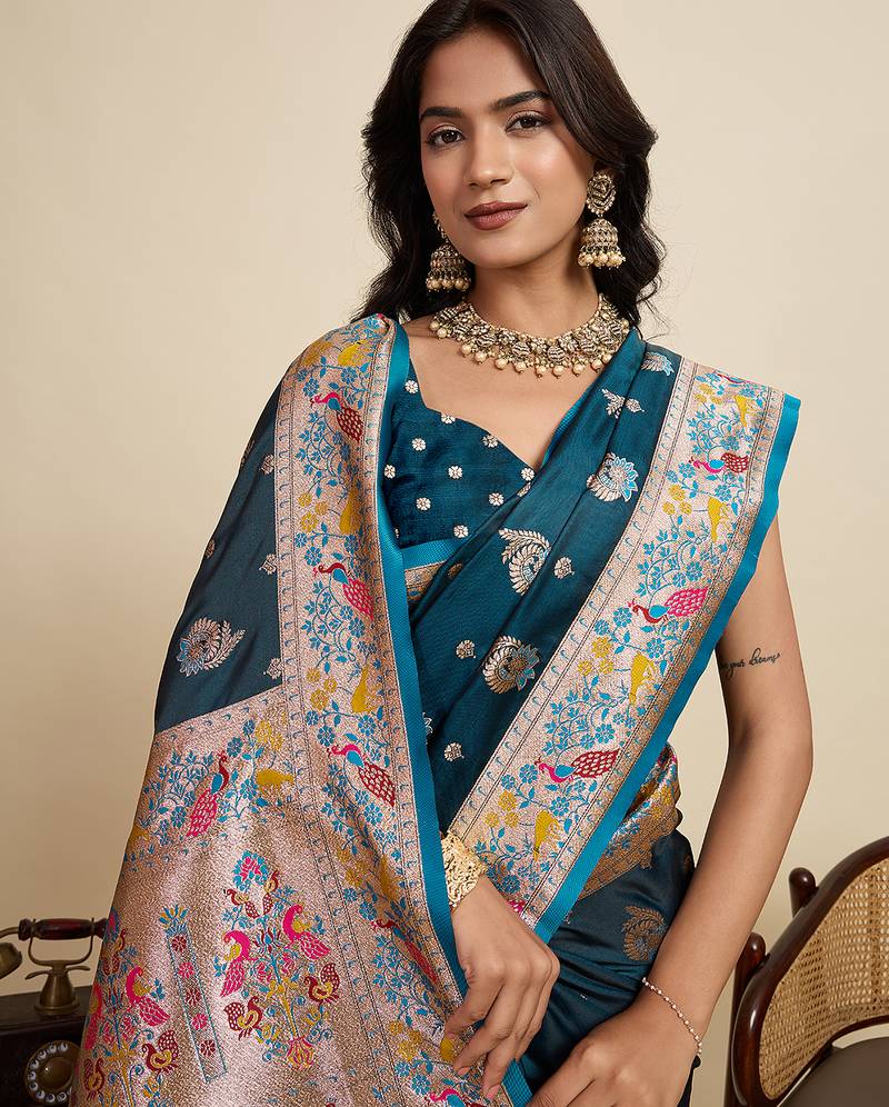 Teal color teal fabric wevon meenakari designer sophisticated ceremonial saree