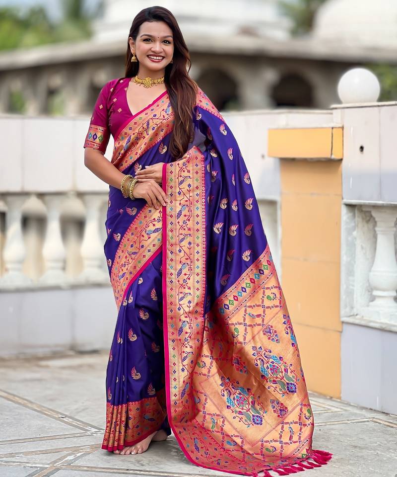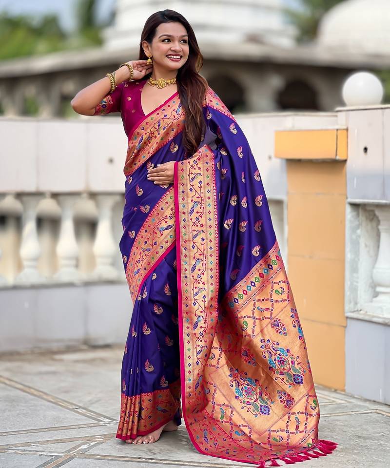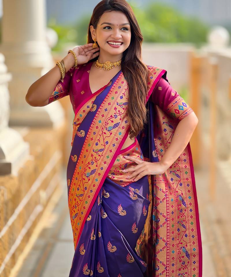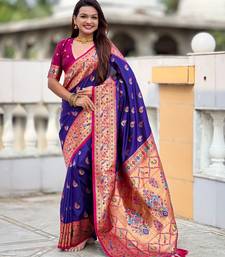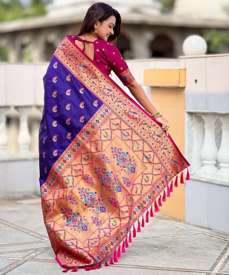 Violet color paithani silk blend woven meenakari jacquard designer saree