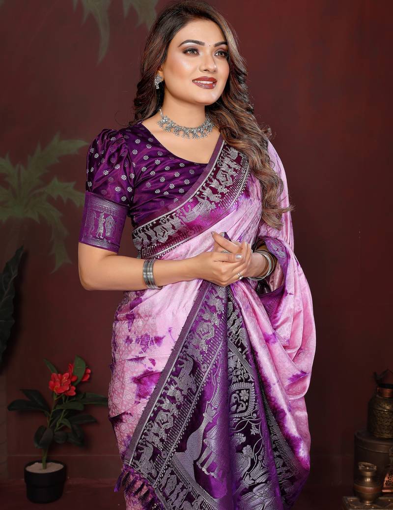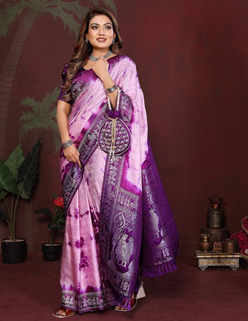 Violet color satin silk fabric saree for ethnic indian looks