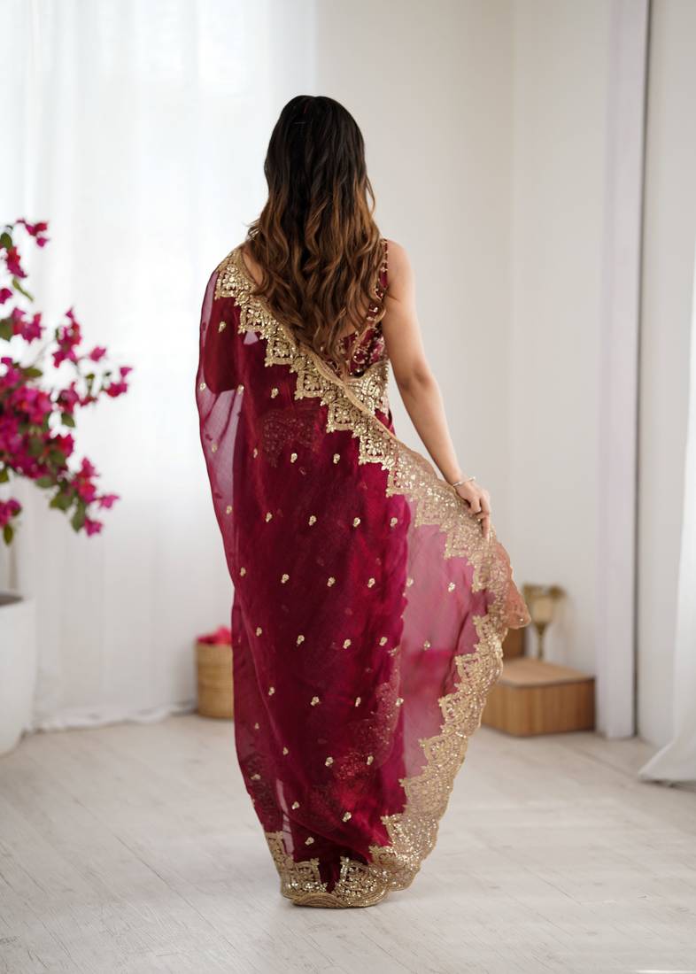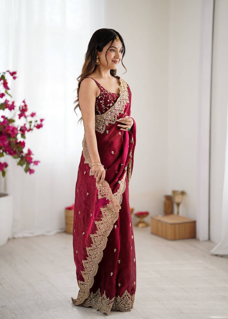 Wine color fendy chiffon fabric beautiful embroidered saree