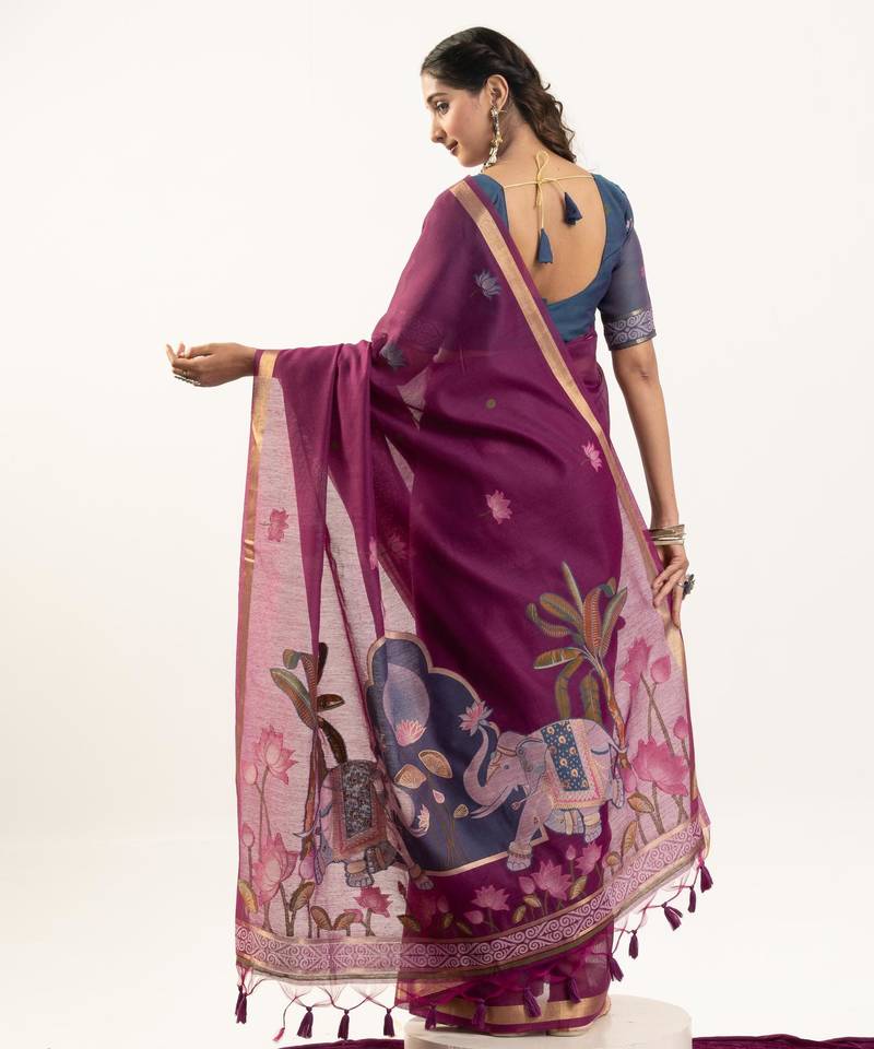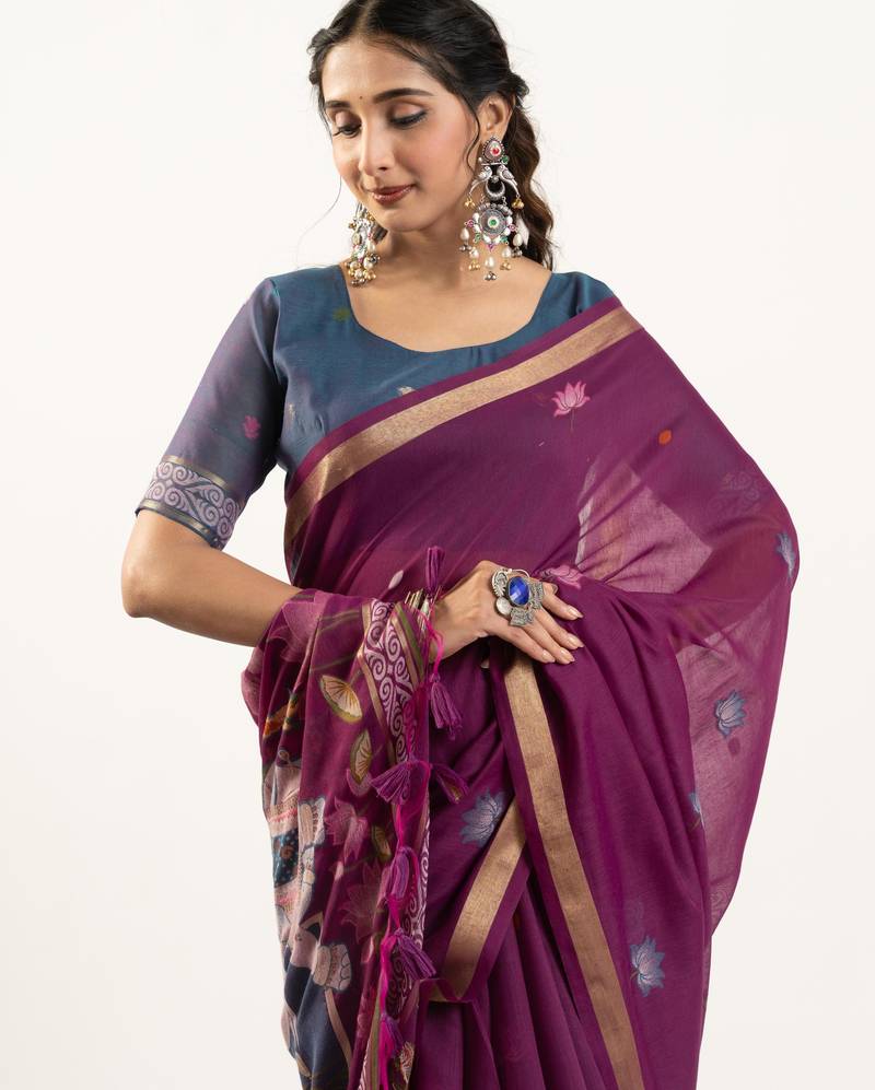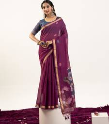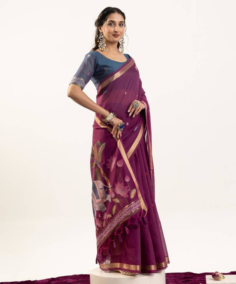 Wine color muga cotton fabric rajwadi weaving designer ethnic classic saree