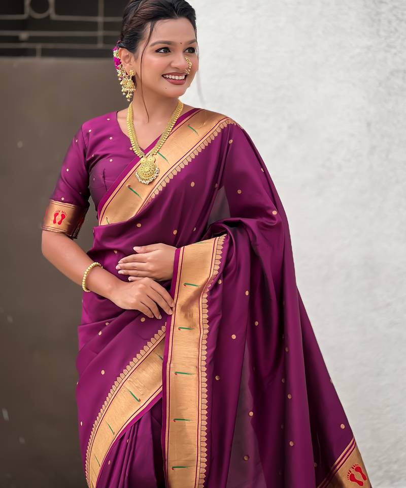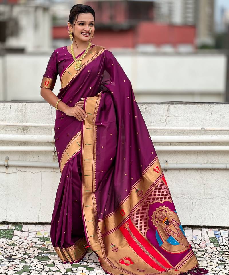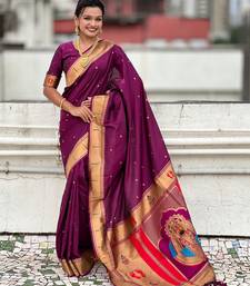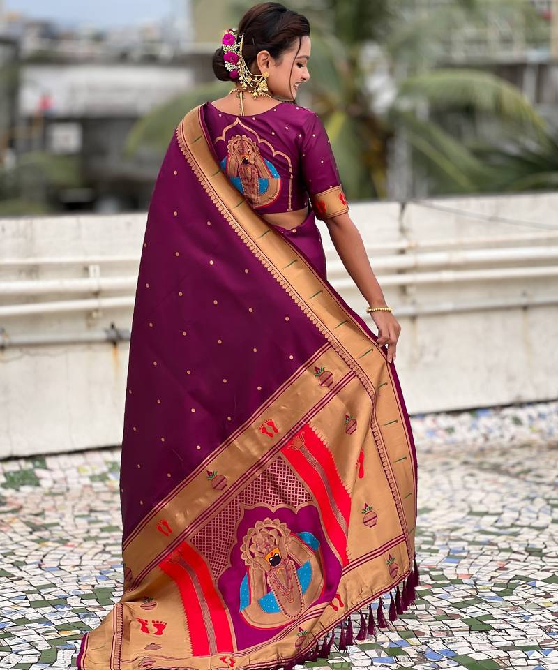 Wine color soft silk blend fabric woven paithani designer cultural rich saree
