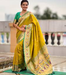 Woven meenakari jacquard designer parrot green color paithani silk blend saree