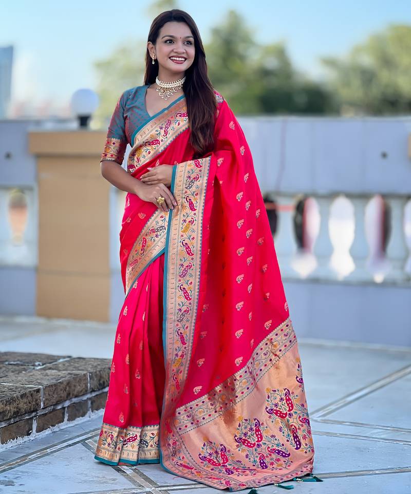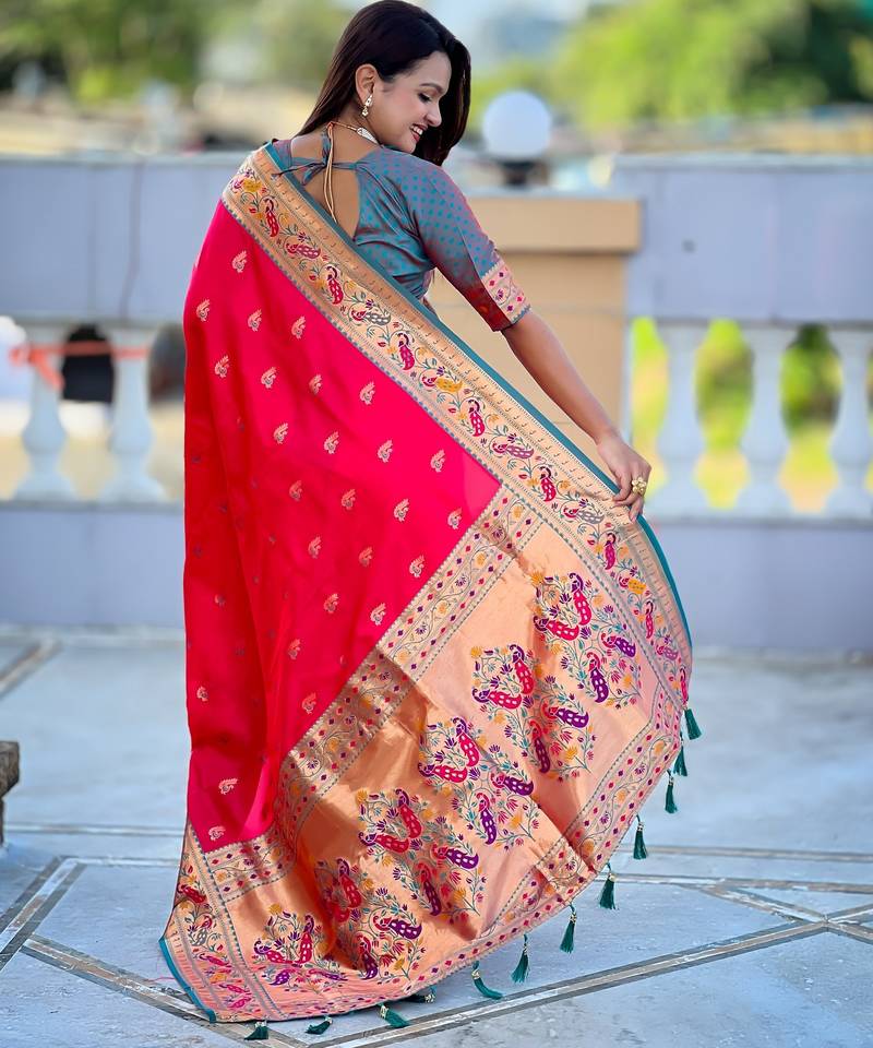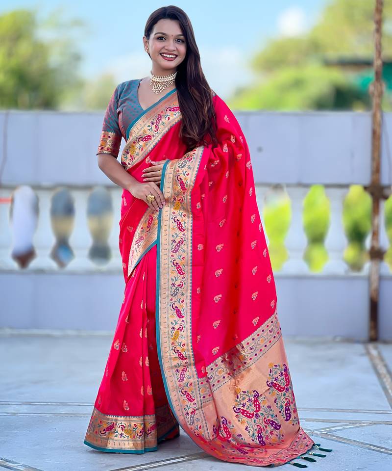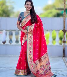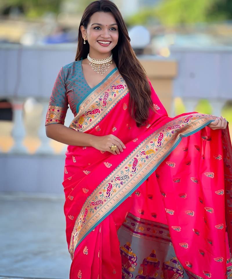 Woven meenakari jacquard designer pink color paithani silk blend saree