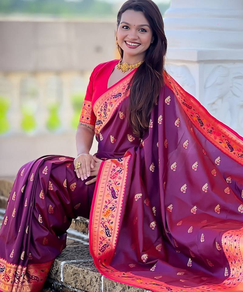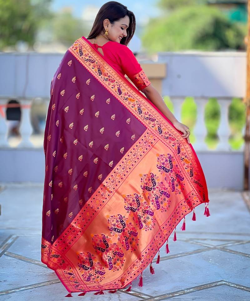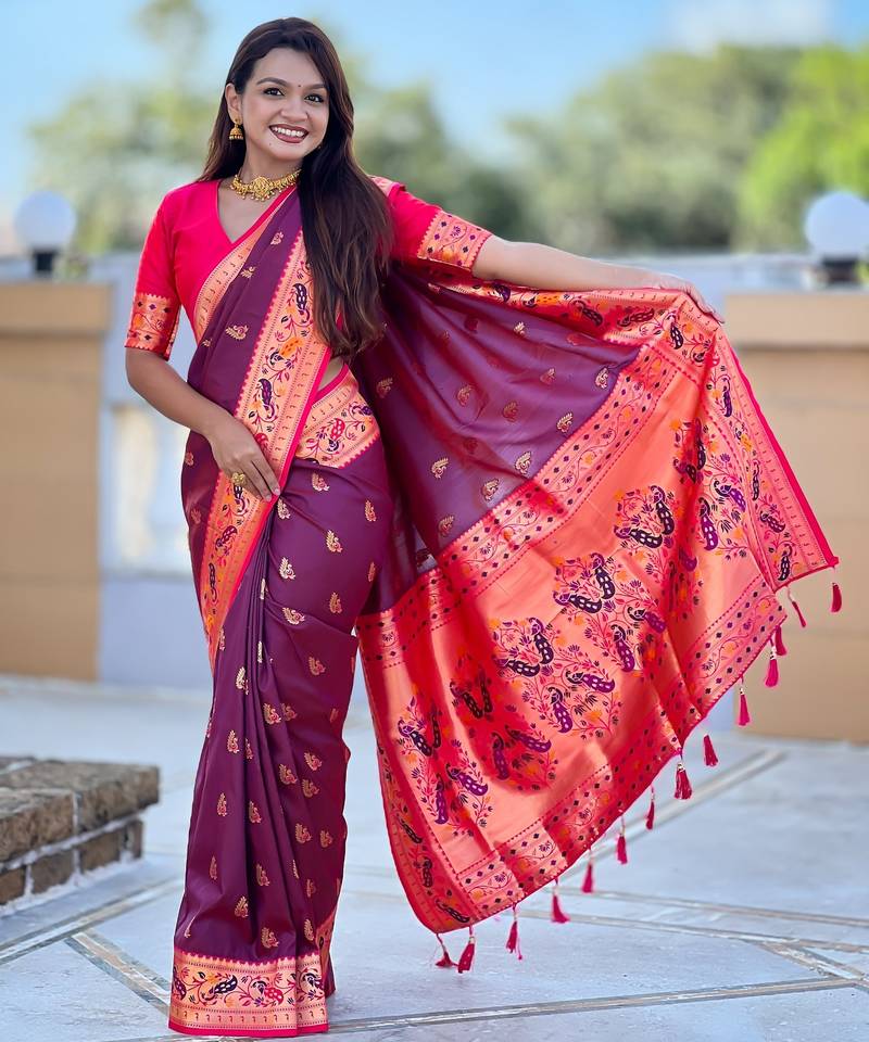 Woven meenakari jacquard designer wine color paithani silk blend saree